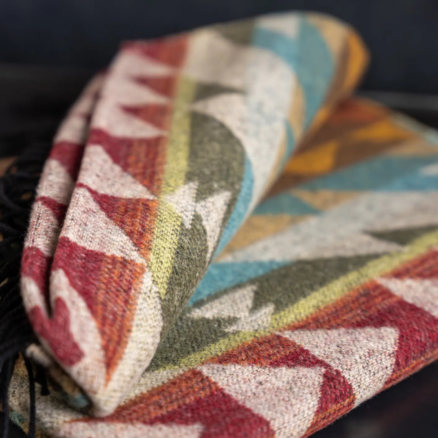 The pattern draws inspiration from the bold geometric language found in Native American textile traditions. At its center stands the buffalo, a symbol of resilience and abundance across many Plains cultures, framed by stepped motifs and directional shapes that echo classic blanket designs. Earthy reds, greens, blues, and gold tones give the wrap a natural warmth, making it easy to pair with everyday outfits.