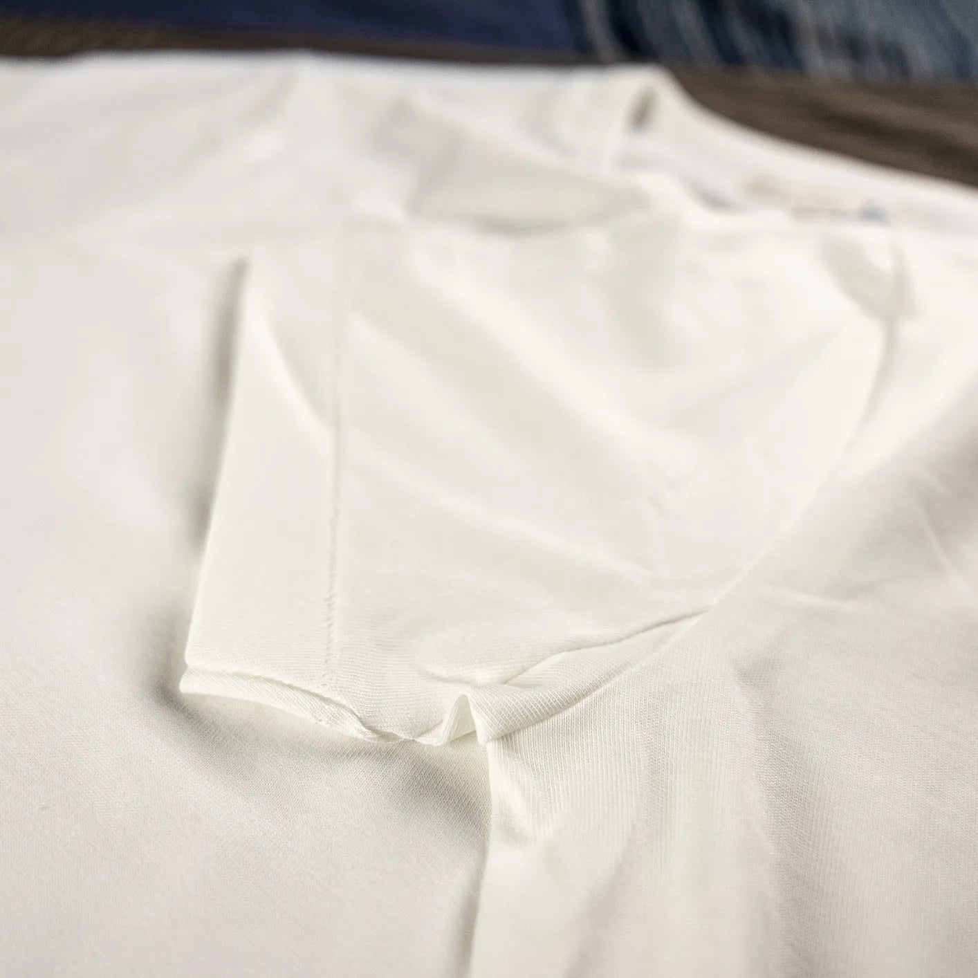 Other refined details include triangular underarm gussets for ease of movement and baseball stitching at the hem for durability. Produced entirely in Germany from 100% organic cotton, the 2M15 combines historical machinery, authentic materials, and precise construction into a T-shirt designed for long-lasting wear.