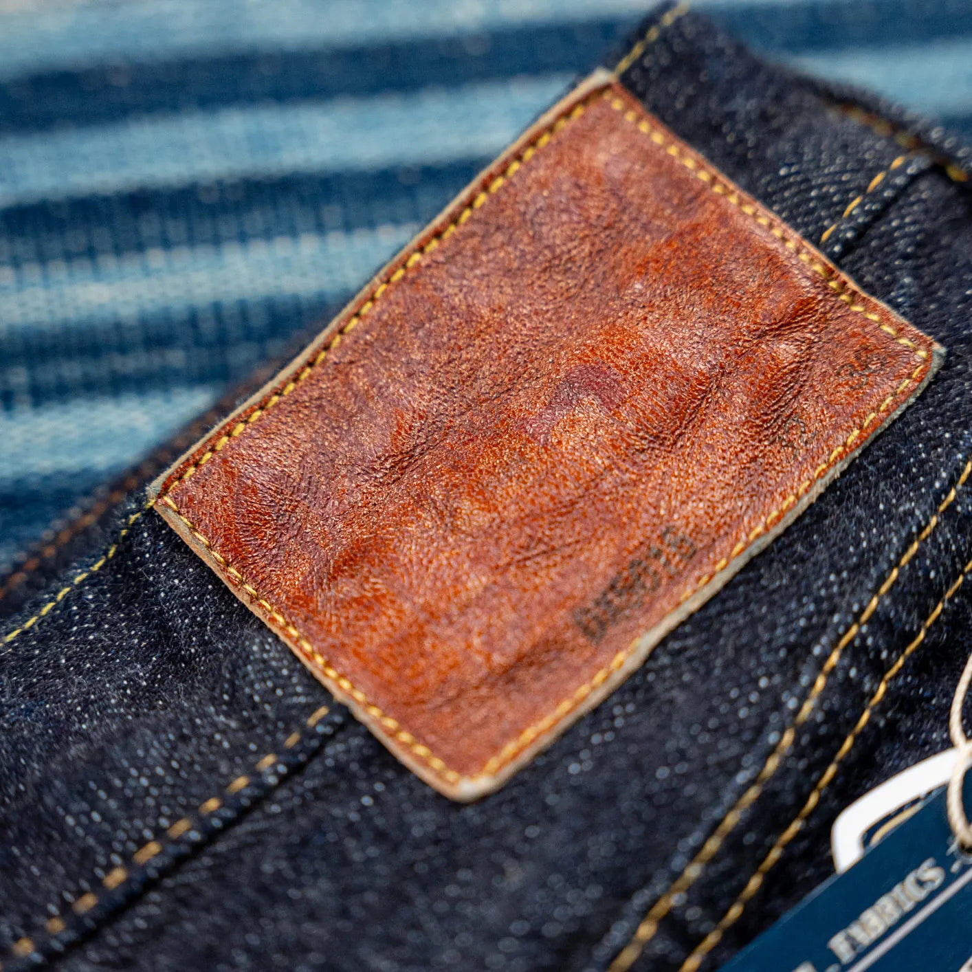 The jeans are built from Deluxeware’s proprietary 15oz “Rogue Denim”, woven in Ibara, Okayama Prefecture on old shuttle looms. Made from American Memphis cotton and rope-dyed in deep indigo, the fabric features a deliberately uneven warp yarn that creates a lively surface texture. Over time this construction develops strong vertical fades, gradually revealing lighter tones while keeping a deep indigo base.