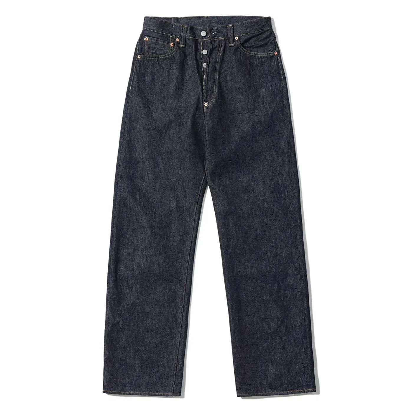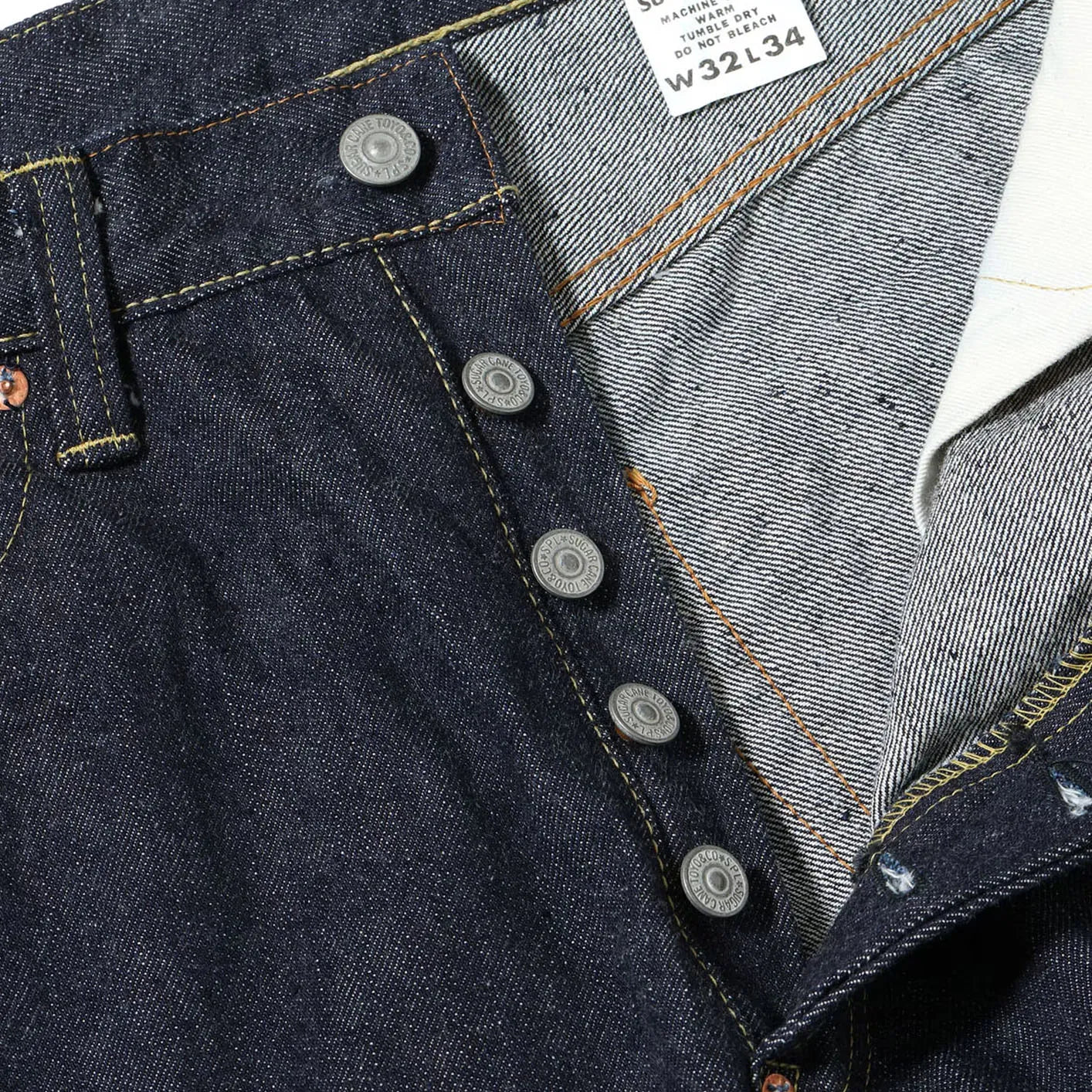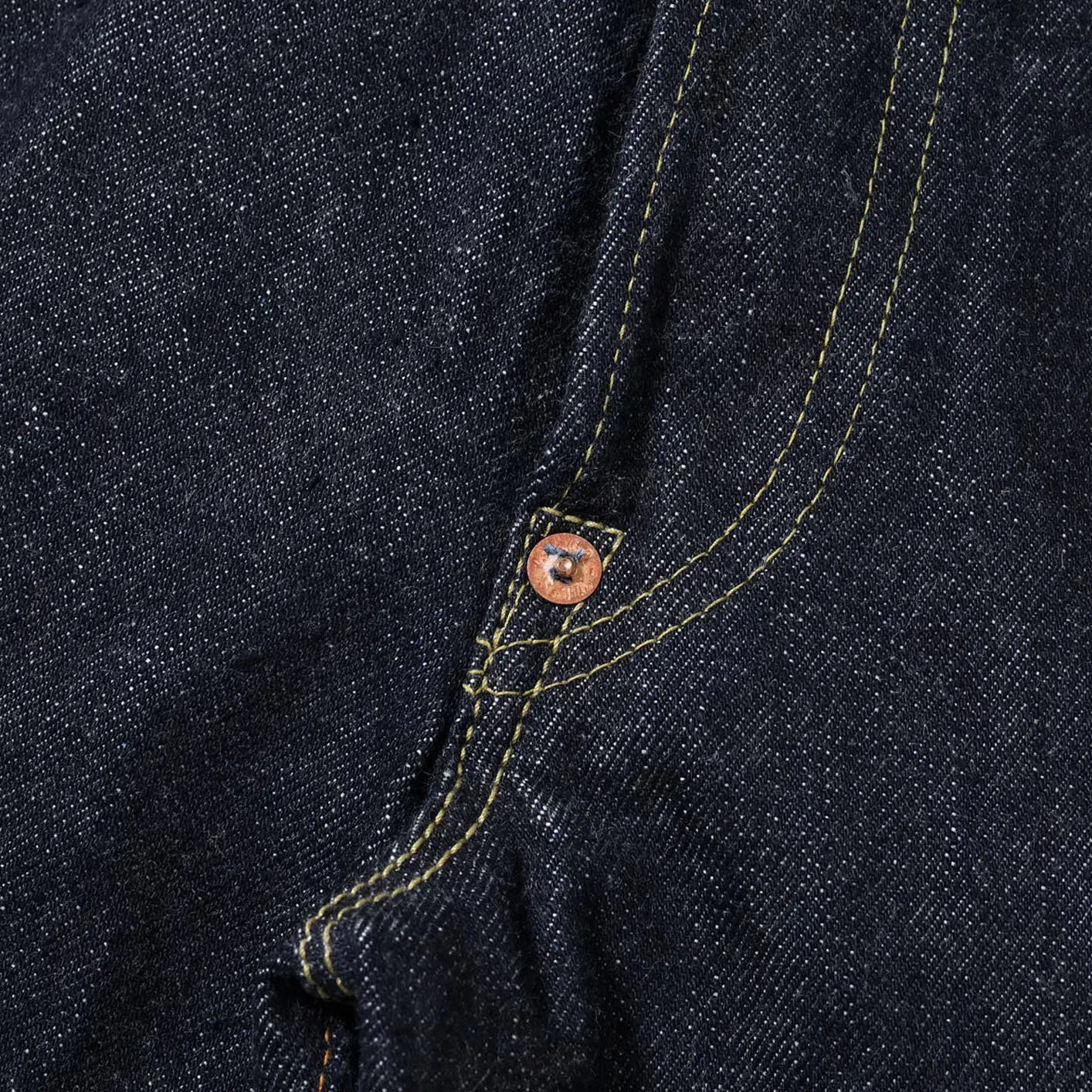 At the core of the design lies Sugar Cane’s renowned 13oz “Standard Denim”, a fabric developed through meticulous study of vintage garments. Unevenly spun yarns recreate the irregular texture of early denim, producing a surface rich with neps and depth. Woven on old shuttle looms and rope-dyed in deep indigo, the fabric promises expressive fading and a beautifully rugged patina as it ages.