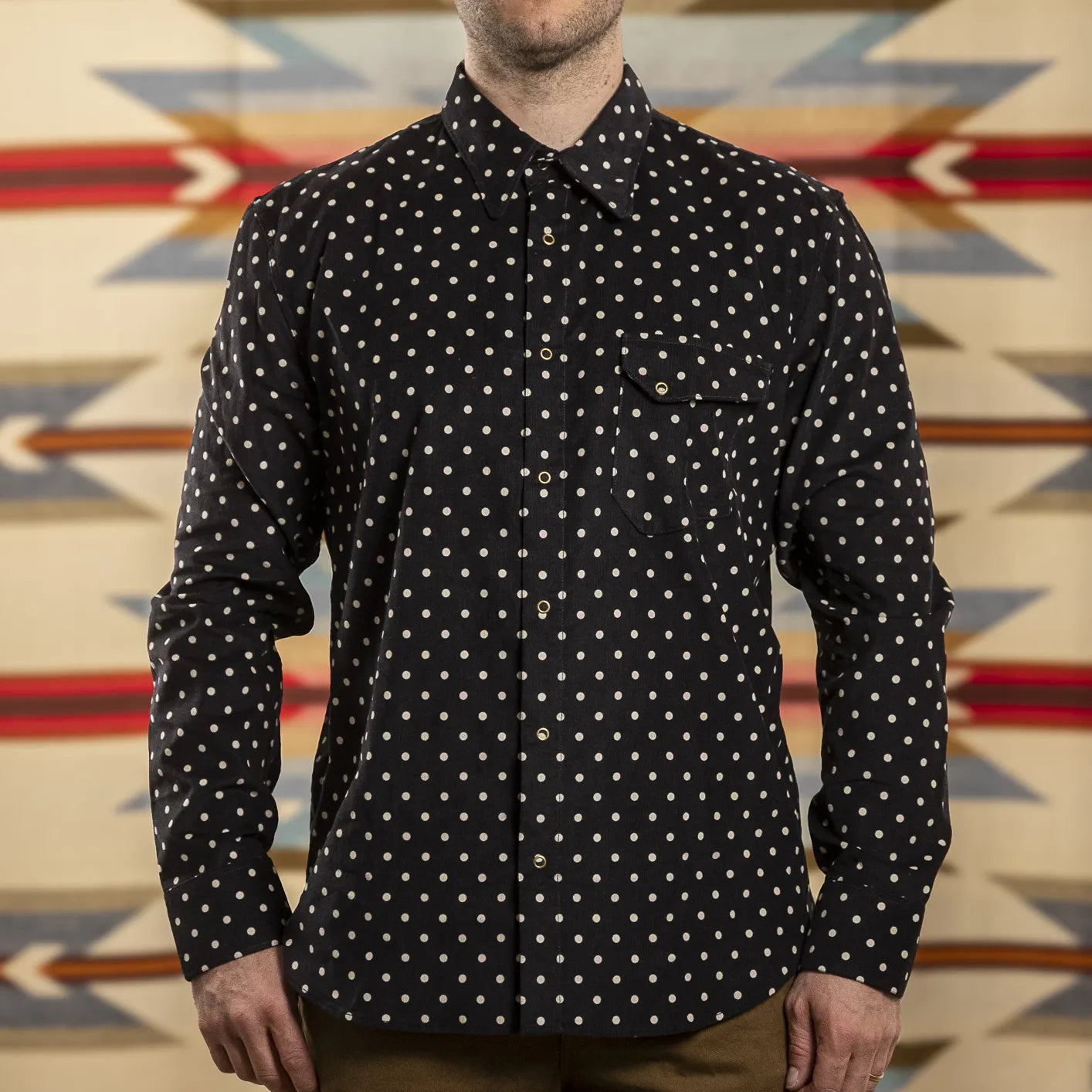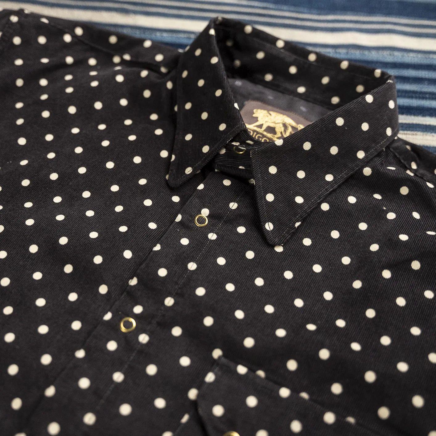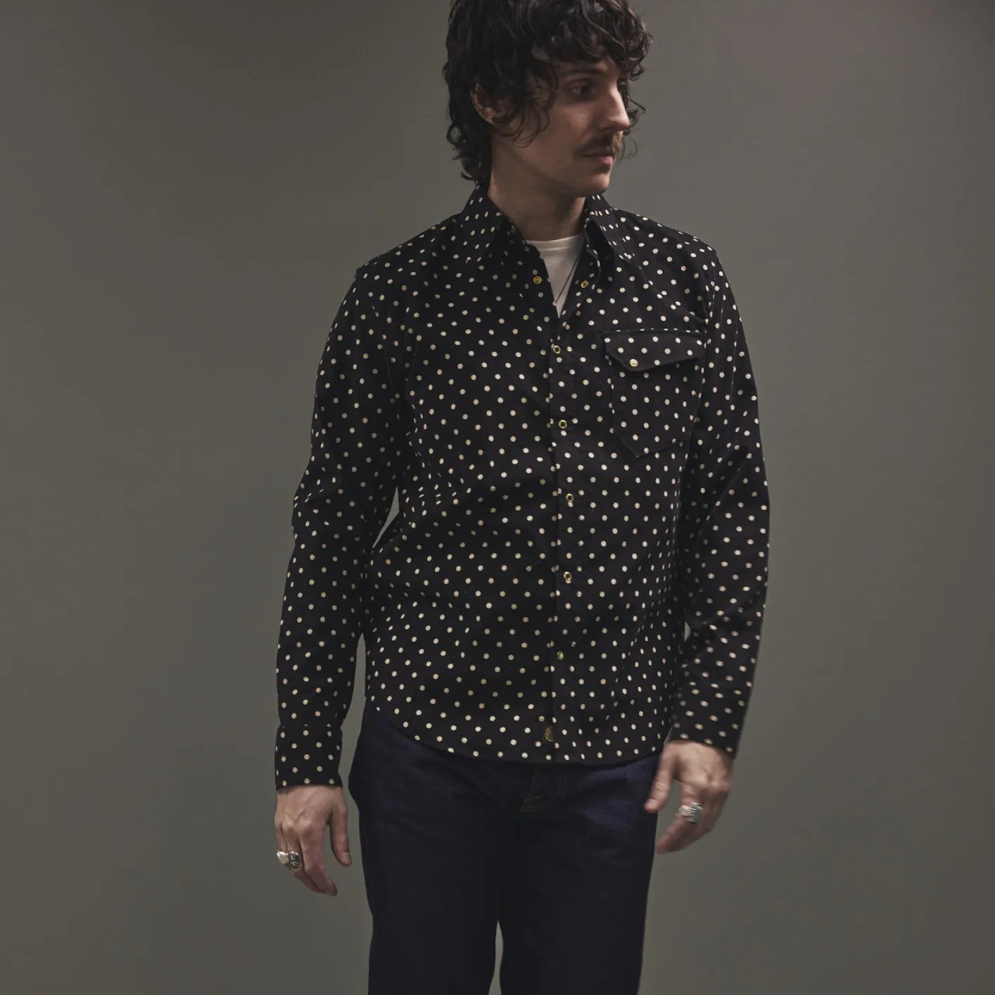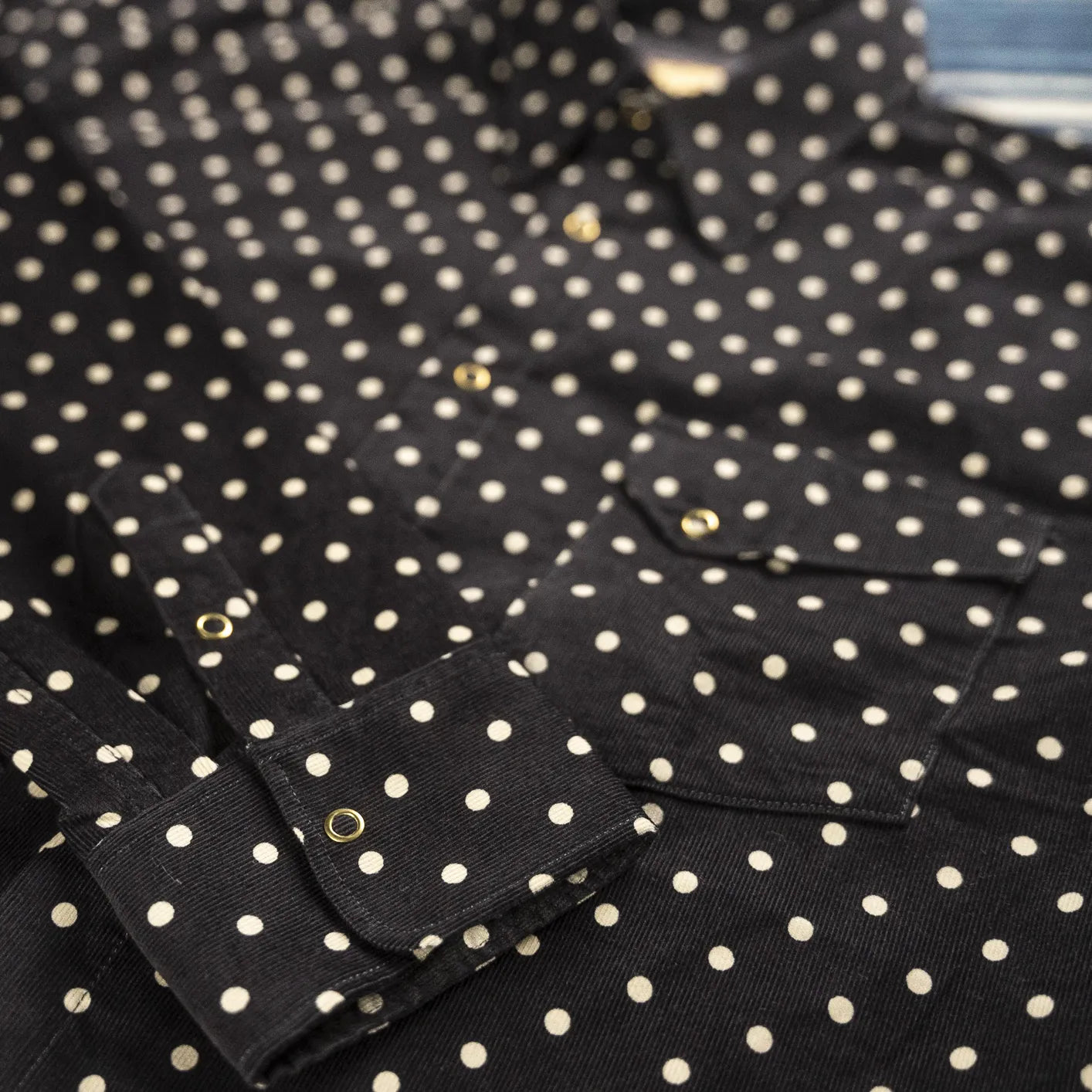 The Indigofera Ike Shirt is a Western classic with a playful twist. Cut from fine baby corduroy (pinwale corduroy), it delivers softness and comfort without losing durability. The black base is covered in bold white polka dots, a pattern whose roots go back to the 19th century when the polka dance craze swept across Europe and America. Dots soon became a symbol of rhythm, joy, and stage presence—picked up by performers from jazz halls to rockabilly dancefloors.