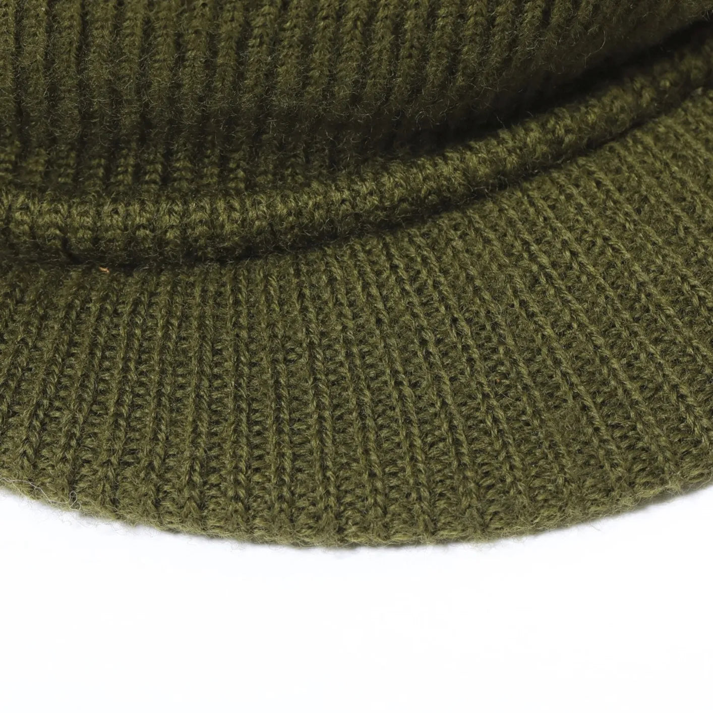 Adopted by the U.S. Army in 1941, the wool “Jeep Cap” was issued to soldiers serving in harsh winter conditions. Its rib-knit crown and short brim allowed it to be worn comfortably under the M-1 steel helmet, while the folded band could be pulled down to protect ears and neck. Buzz Rickson’s recreates this military icon in Japan using pure wool and authentic six-panel construction, complete with reinforced seams and a shape-retaining visor. The cap carries a size label “M,” but is designed as a one-size-fits-most model, true to the original issue standard. Initially favored by jeep drivers and infantrymen across Europe, it remains a functional and timeless symbol of American fieldwear—built for warmth, comfort, and authenticity.