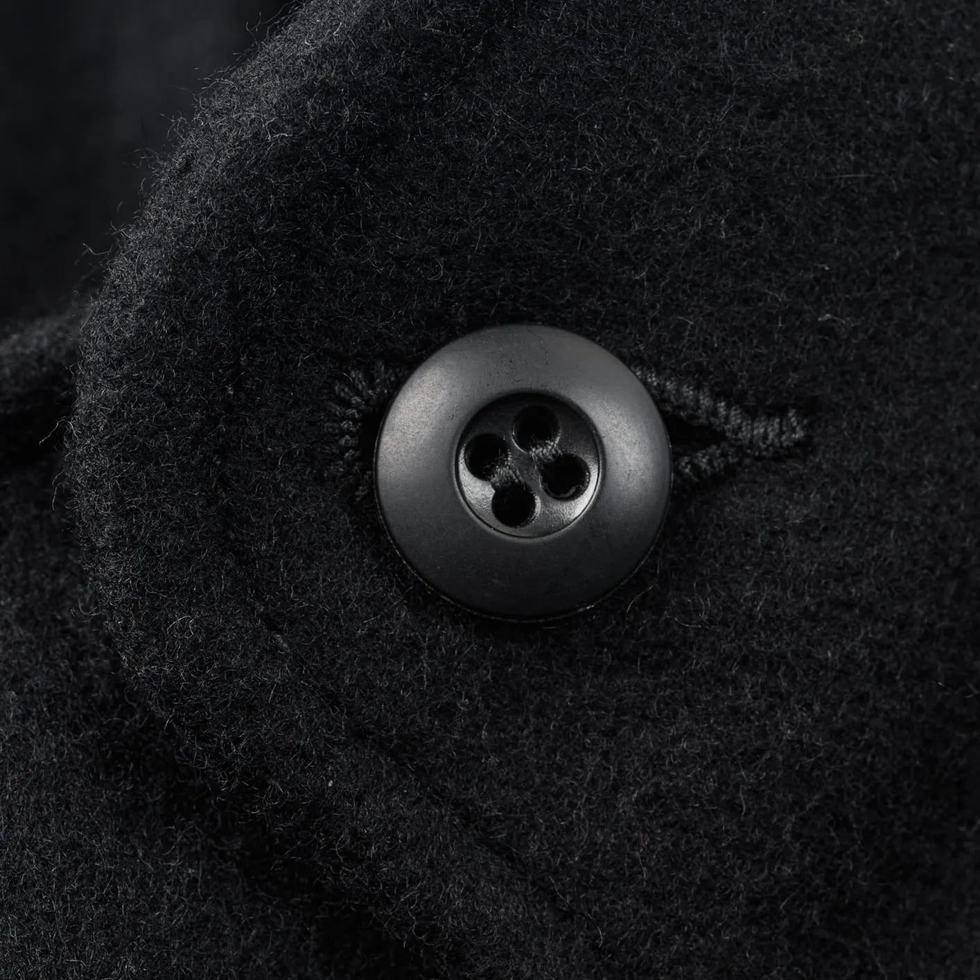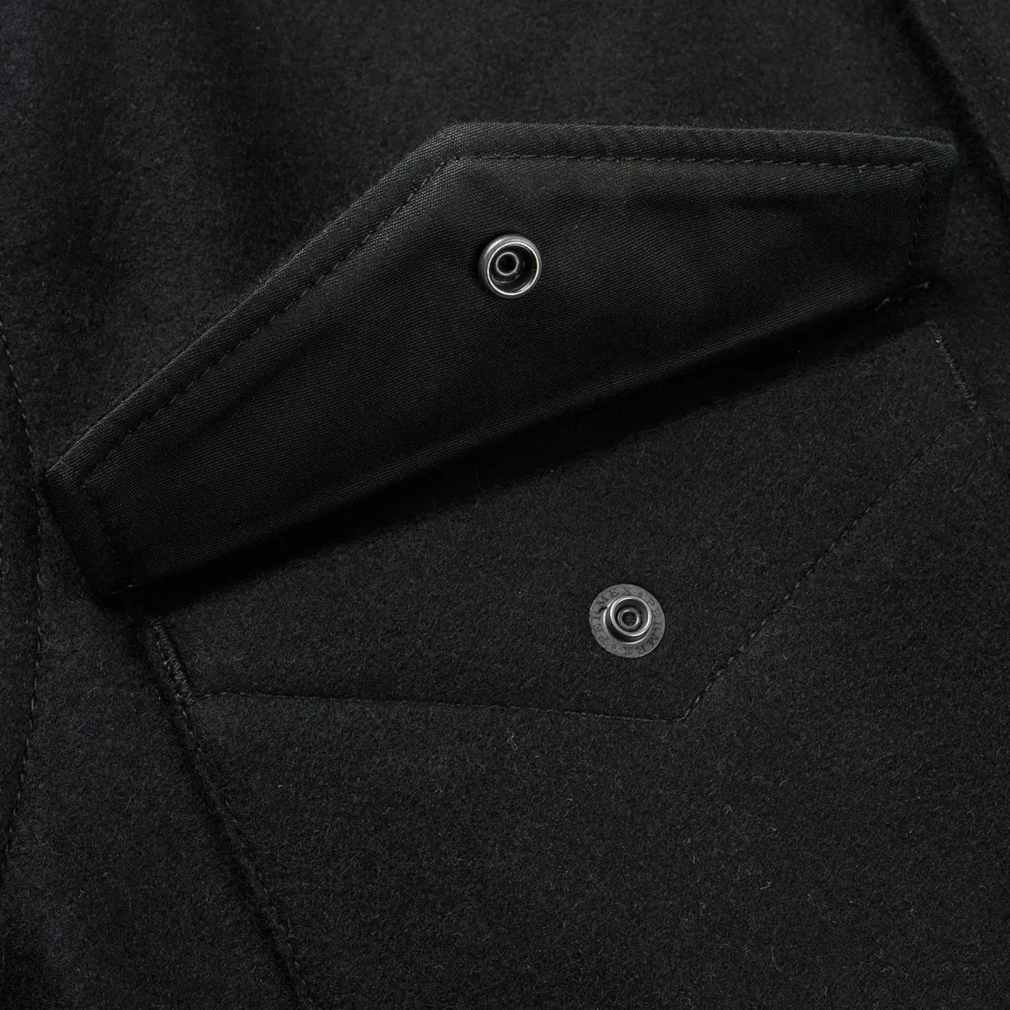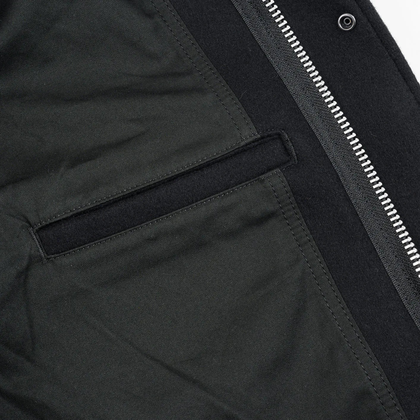 The shell is made from 21oz Japanese Melton wool, woven at an exceptionally high density and blended with 10% nylon for added durability. The fabric is naturally windproof and remarkably warm, while the 6.2oz Japanese Ventile cotton lining adds water resistance without sacrificing breathability. Inside, polyester twill sleeve linings ensure easy layering, while reinforced stitching, over-spec hardware, and a two-way YKK zipper underline the jacket’s utilitarian roots.