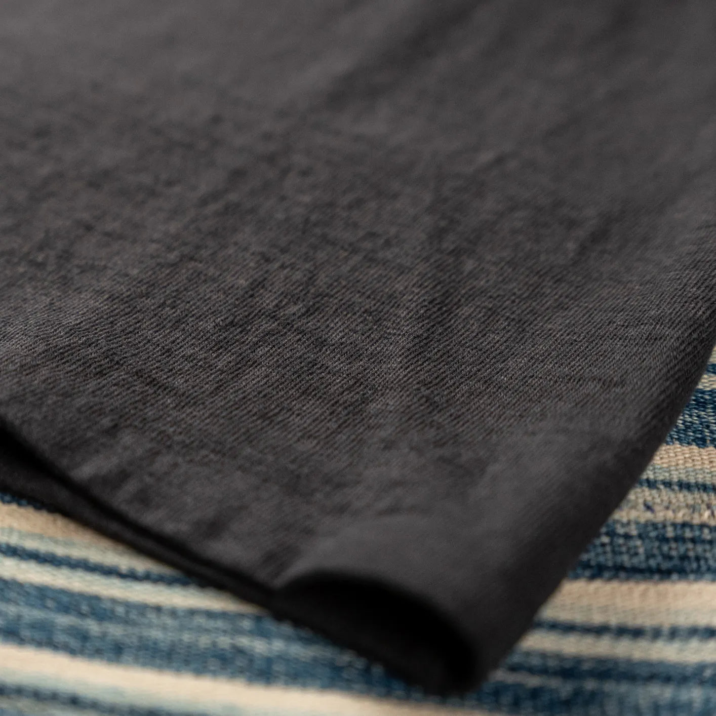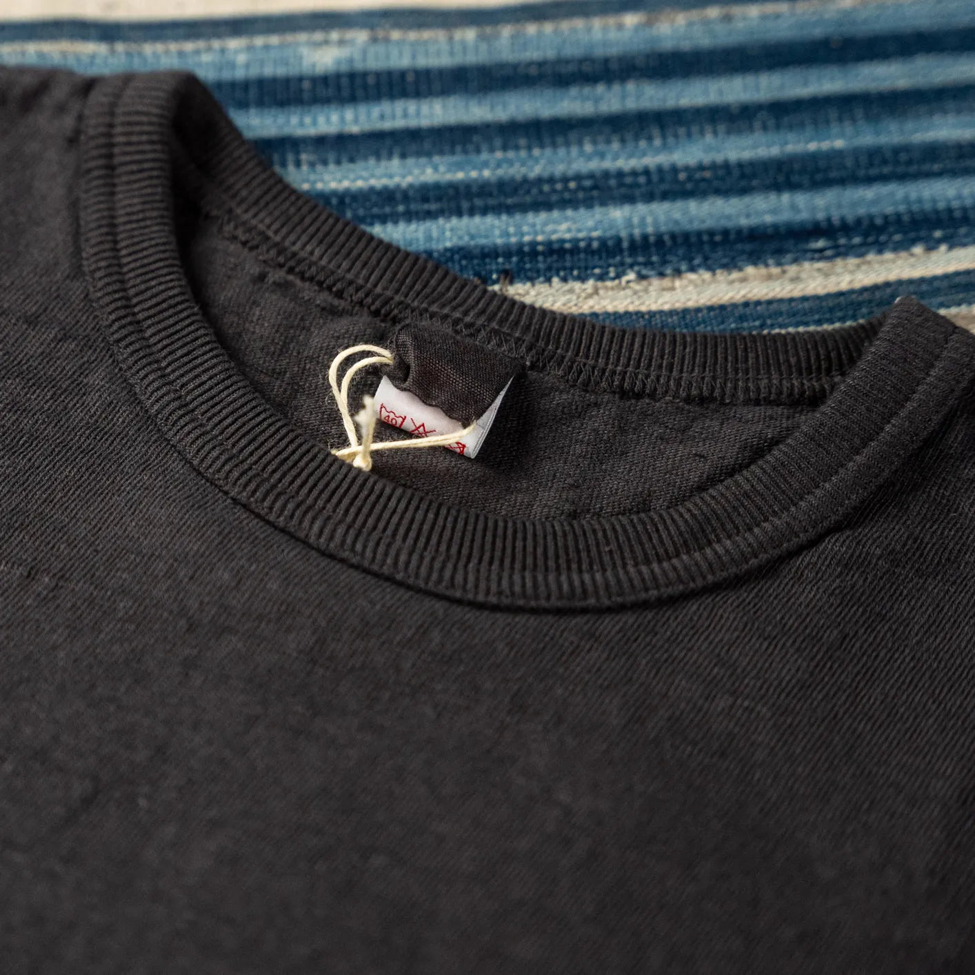 Its distinctive texture comes from UES’ proprietary yarn blend featuring extra-thick slub cotton and pronounced nep fibers. These irregularities create a tactile surface with visible depth, a hallmark of low-tension knitting. Soft to the touch yet remarkably sturdy, the fabric becomes increasingly expressive over time.