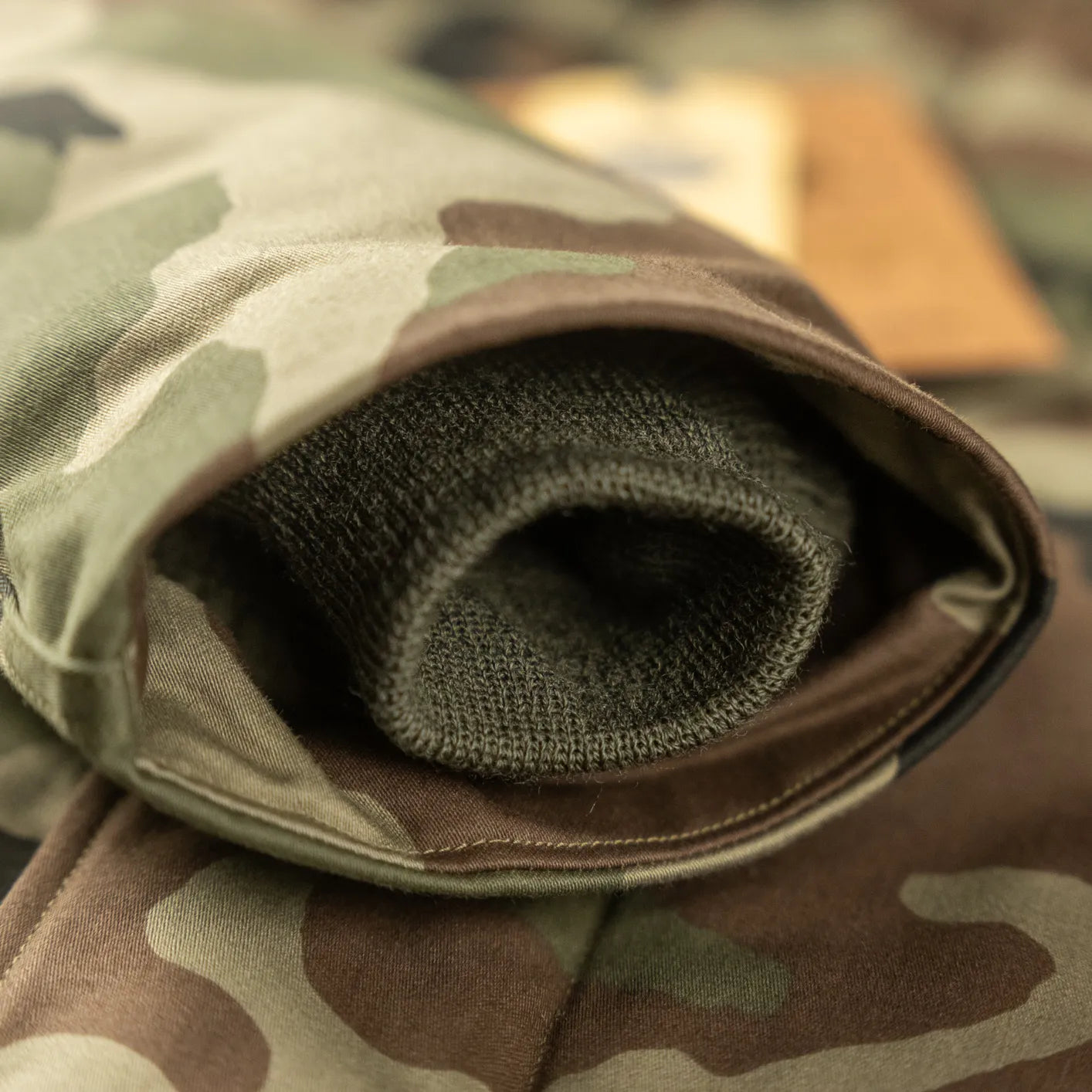 While earlier versions were constructed from heavy cotton back satin, this later model introduced a durable 50/50 cotton-nylon shell, developed for improved strength, reduced weight, and faster drying times at sea. The woodland camouflage version, newly introduced alongside the olive model, reflects the 1980s generation worn by naval personnel during training and coastal operations. Inside, a soft nylon-pile lining (70% polyester, 30% acrylic) provides warmth, while wool storm cuffs seal out cold and wind. Authentic details include mil-spec urea buttons, a brass CONMATIC zipper, and adjustable waist tabs for a refined fit.