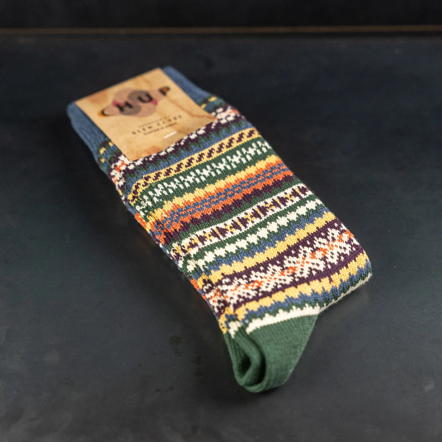 Crafted from a soft, breathable cotton blend, the Horizont offers exceptional comfort and the signature CHUP clarity of pattern. Each pair is knitted slowly on traditional stocking frame machines, allowing the complex colorwork to emerge with precision. It’s a sock designed to bring a sense of calm, rhythm, and visual warmth to everyday wear.