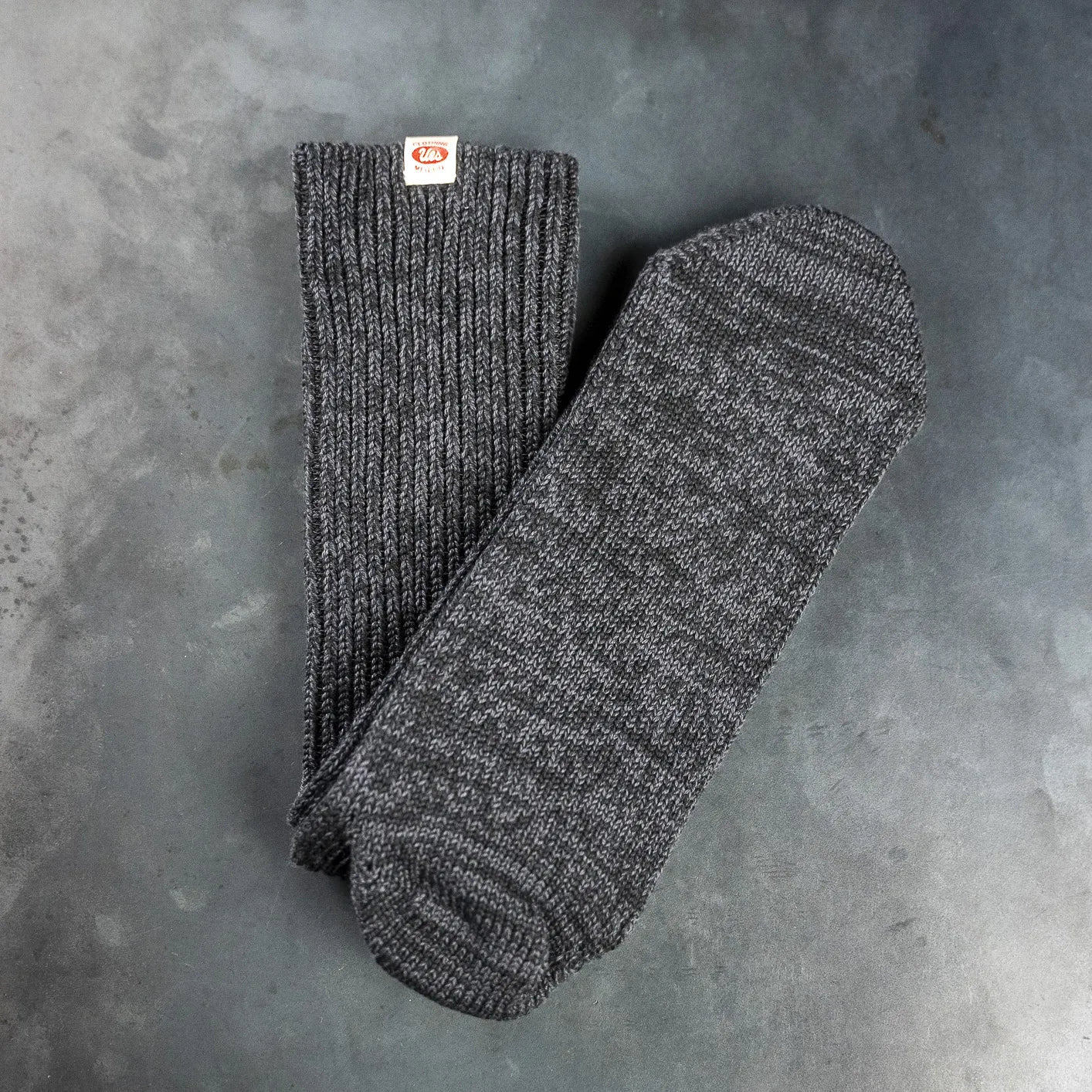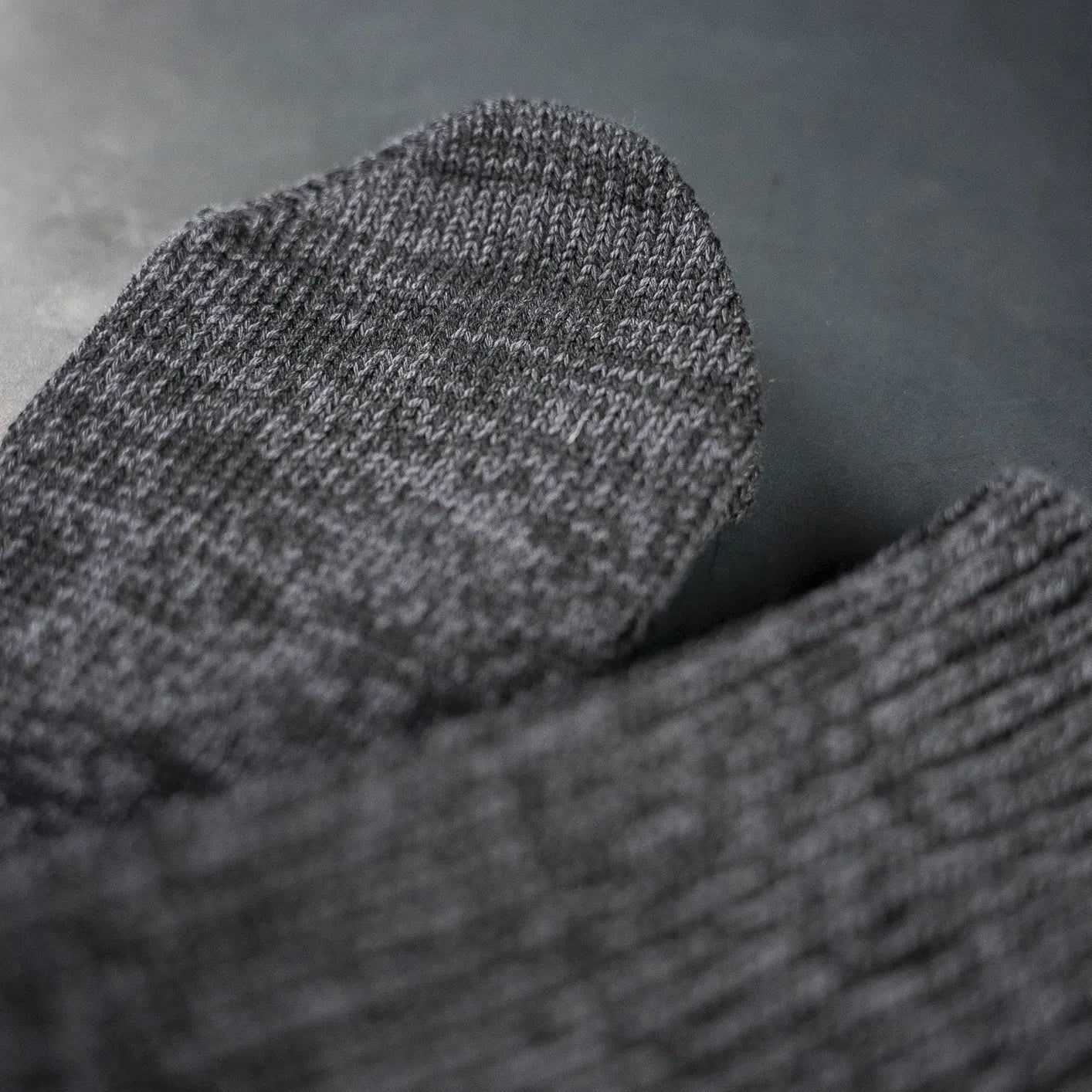 Four differently colored threads are spun together, producing a rich melange tone and a soft, irregular surface that reflects the charm of old-world knitwear. The result is a pair of socks that feel substantial yet relaxed, with natural elasticity in the ribbed cuff for a perfect fit.