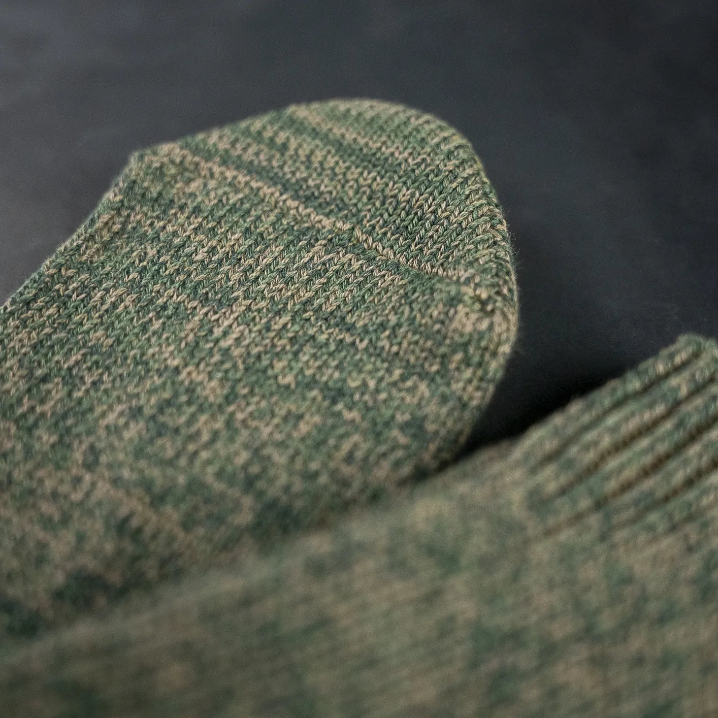 Four differently colored threads are spun together, producing a rich melange tone and a soft, irregular surface that reflects the charm of old-world knitwear. The result is a pair of socks that feel substantial yet relaxed, with natural elasticity in the ribbed cuff for a perfect fit.