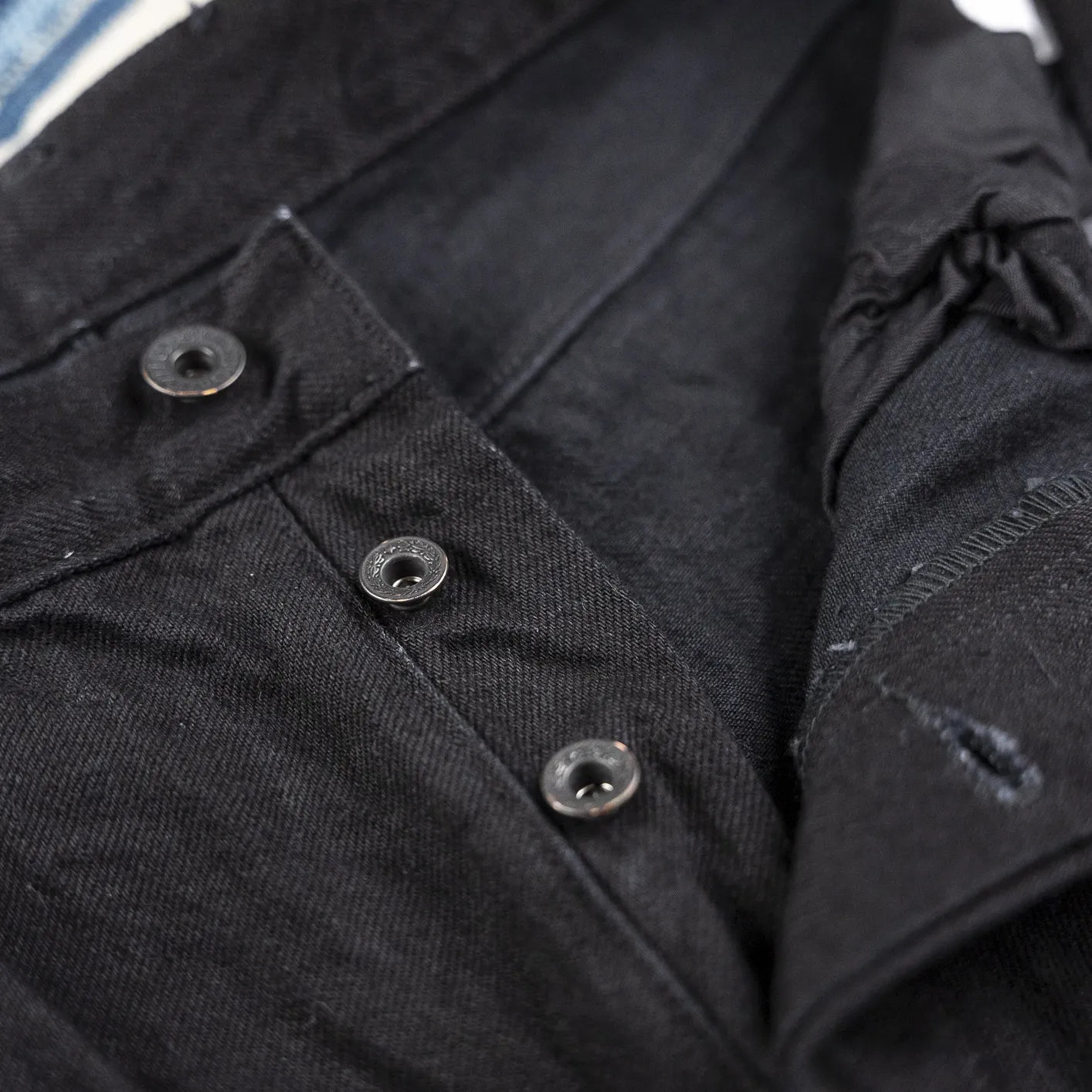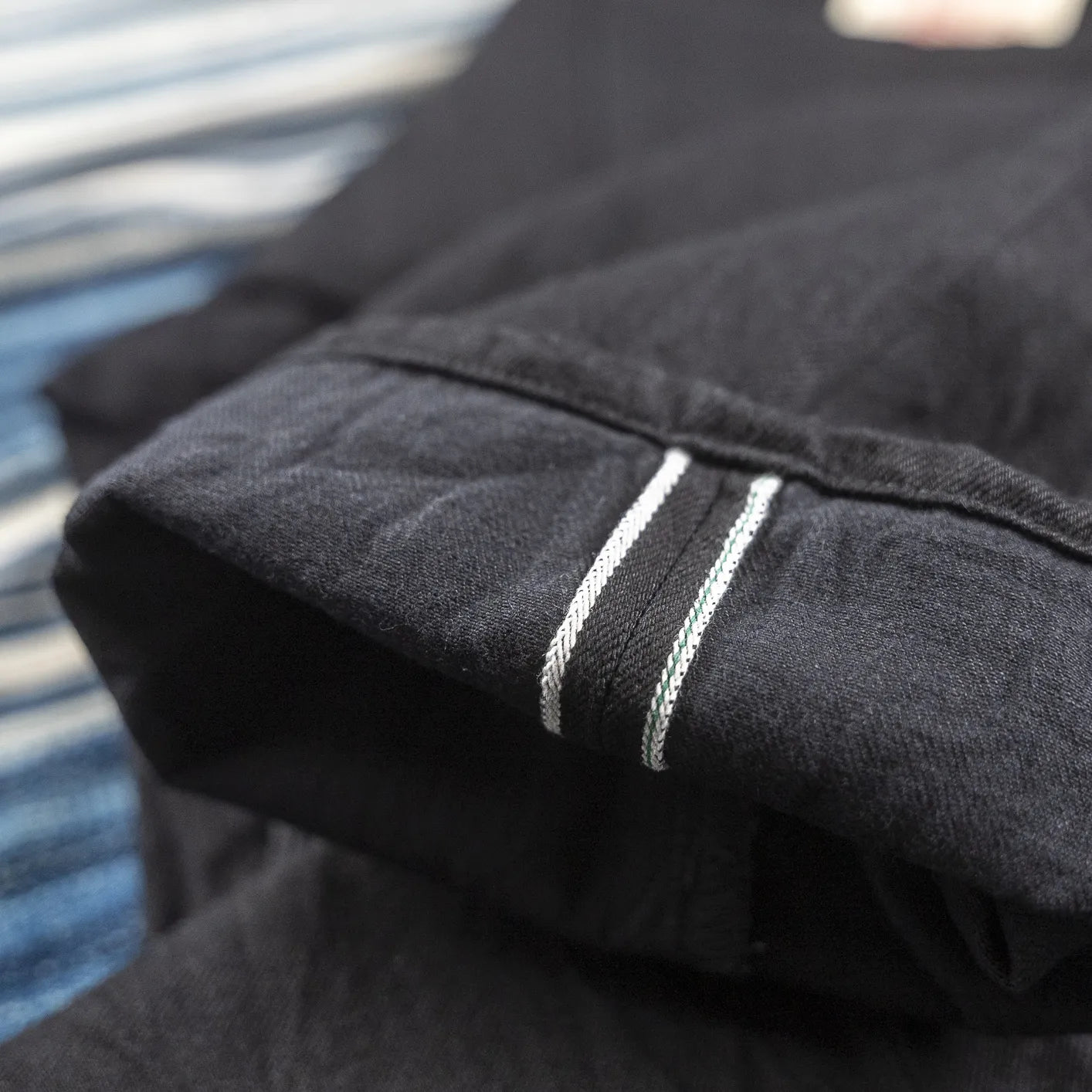 For the Encinitas, Stevenson Overall's uses a custom 12oz black selvedge denim, woven exclusively for them on vintage Toyoda Looms by the renowned Kuroki mill in Okayama. The denim has a beautiful uneven texture, develops a unique patina with wear. Flat-felled seams with fine single-stitching, a construction method dating back to the 1920s, is also a distinguishing feature of these black 150-OSS SOC jeans.