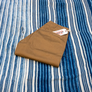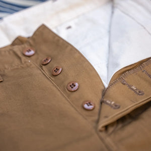 The combat chino cloth is made from 100% combed cotton yarn, tightly woven and sanforized for durability and a clean, structured drape. What immediately stands out is the beautifully balanced brown tone—subtle yet rich, warm yet earthy. It’s a color that captures the spirit of mid-century military garments while remaining rare in today’s market. Double-stitched rolled seams, 2mm welted back pockets, urea buttons, and a button fly complete the historically accurate build. With wear, the fabric softens beautifully, developing the kind of patina that makes vintage lovers smile.