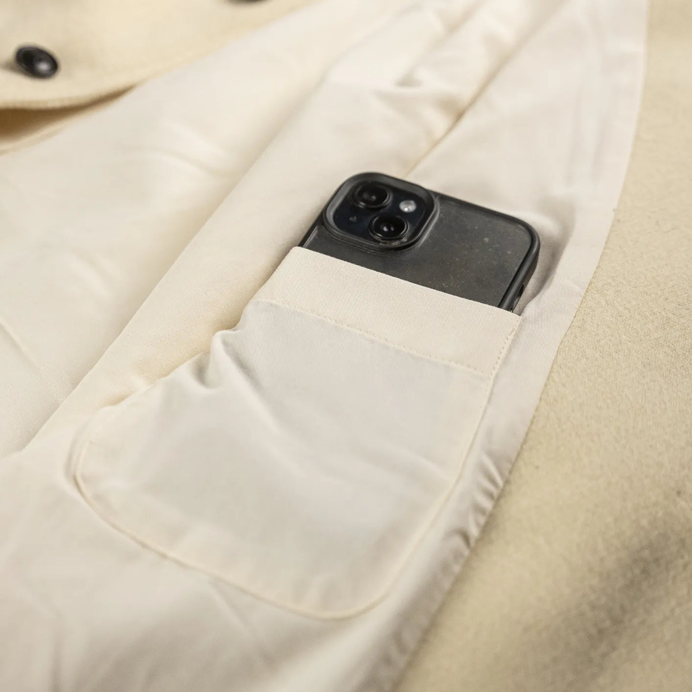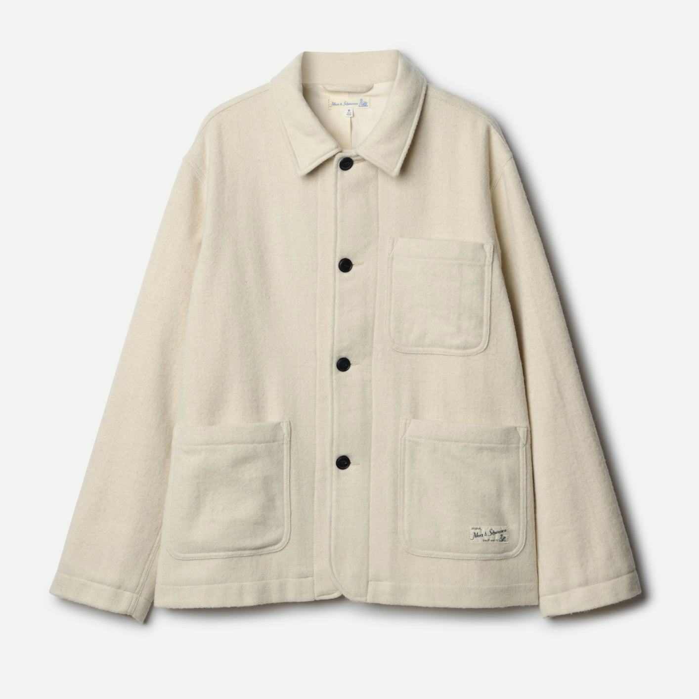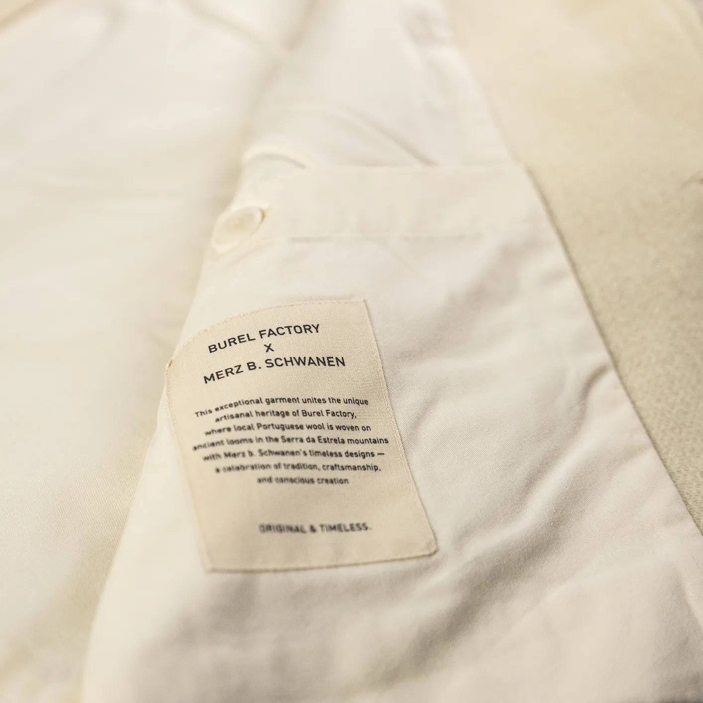 Produced in collaboration with the Burel Factory, the material is woven on ancestral 19th-century looms and finished by hand. Its 13.3oz weight provides a substantial yet breathable structure, perfectly suited for colder days. Details such as corozo buttons, a single chest pocket, and two hip patch pockets underline the workwear inspiration, while underarm gussets allow ease of movement. A woven Burel Factory x Merz b. Schwanen label on the inside marks the collaboration.