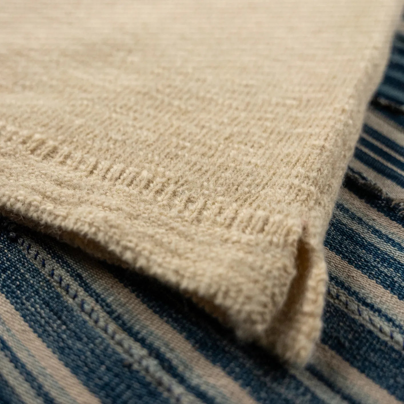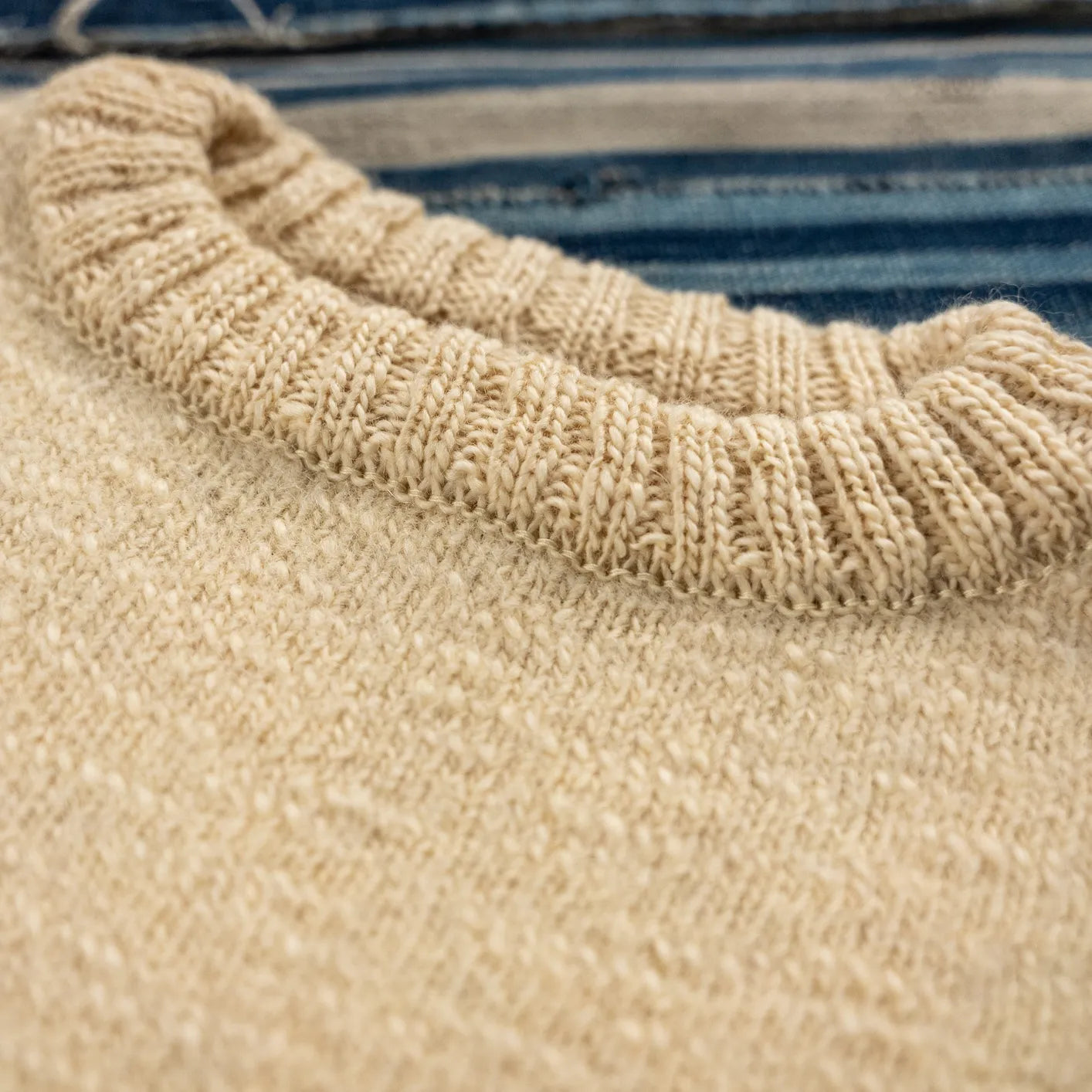 Crafted in Japan from pure wool, the yarn is knitted at high density to create a compact, resilient fabric with natural insulation. Unlike traditional lanolin-heavy maritime sweaters, this version is carefully balanced to reduce excessive weight and scratchiness while preserving structure and warmth. The rib-knit construction is not merely decorative. Rib-knit sections at the sleeves enhance elasticity and ensure a secure, anatomical fit, allowing the sweater to move naturally with the body while maintaining structure. The ribbed cuffs seal out cold wind, preserving warmth in demanding conditions.