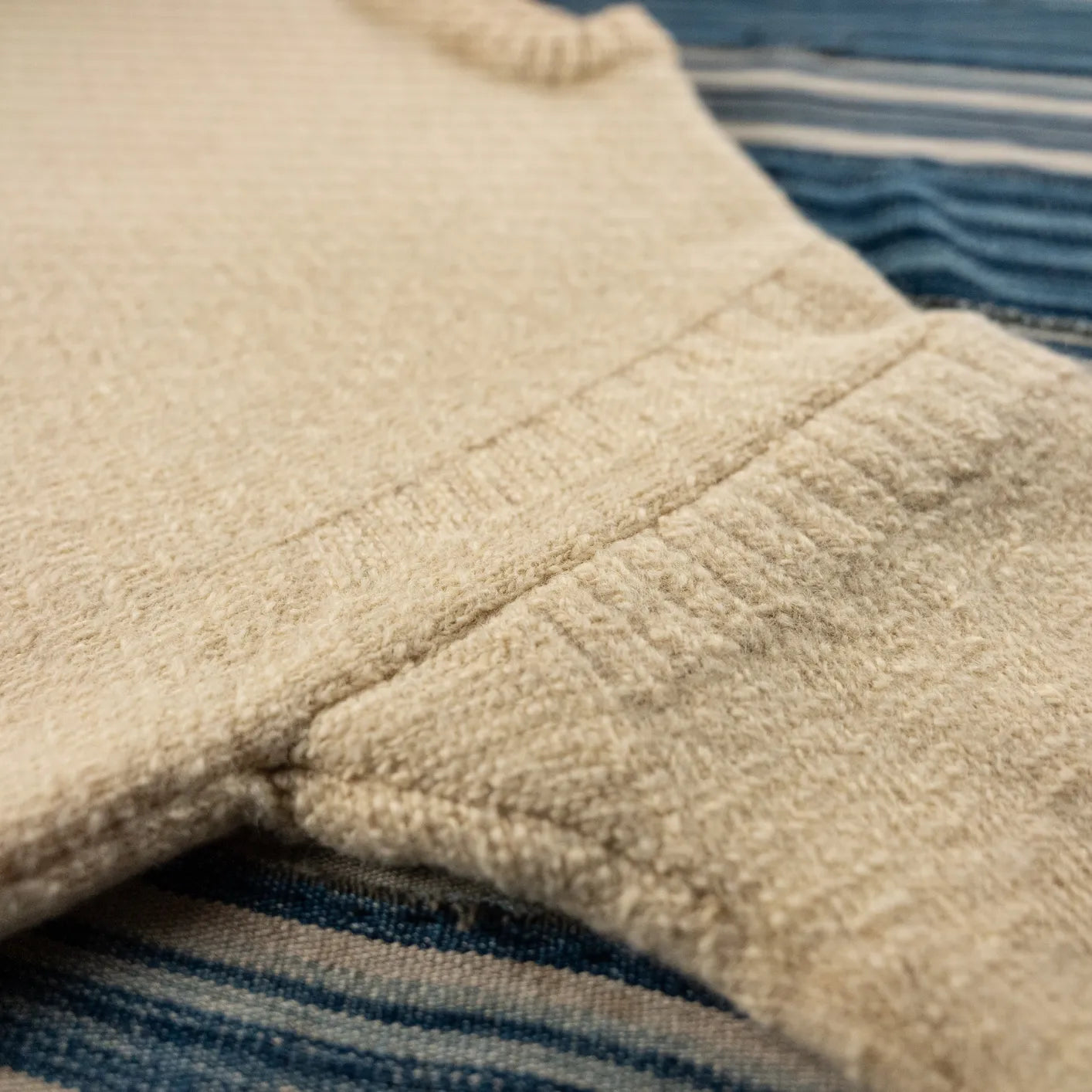 Another functional detail lies at the hem: side vents provide subtle expansion and improved mobility, preventing tension when layering and allowing the sweater to sit cleanly whether worn under a jacket or on its own. This detail, rooted in workwear logic, increases comfort without disrupting the silhouette.