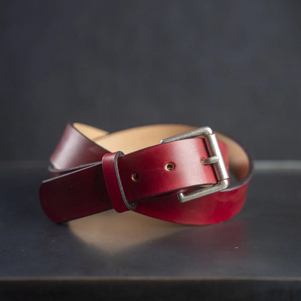 This limited Statement Edition of the Barnes & Moore Roller Belt is made from thick, vegetable-tanned leather, hand-dyed in Benishuho Red using Japanese water-based dye. Each piece develops its own subtle patina.