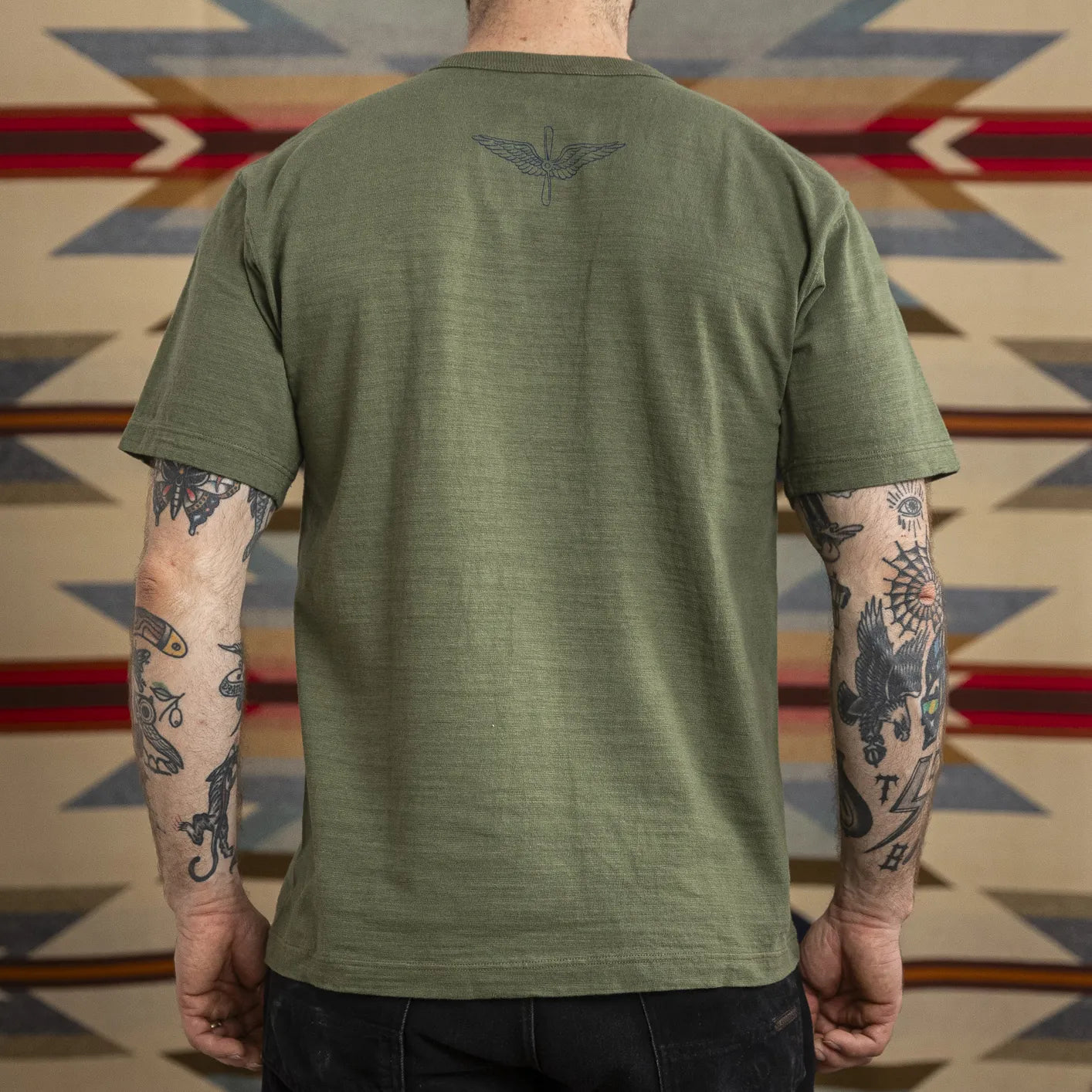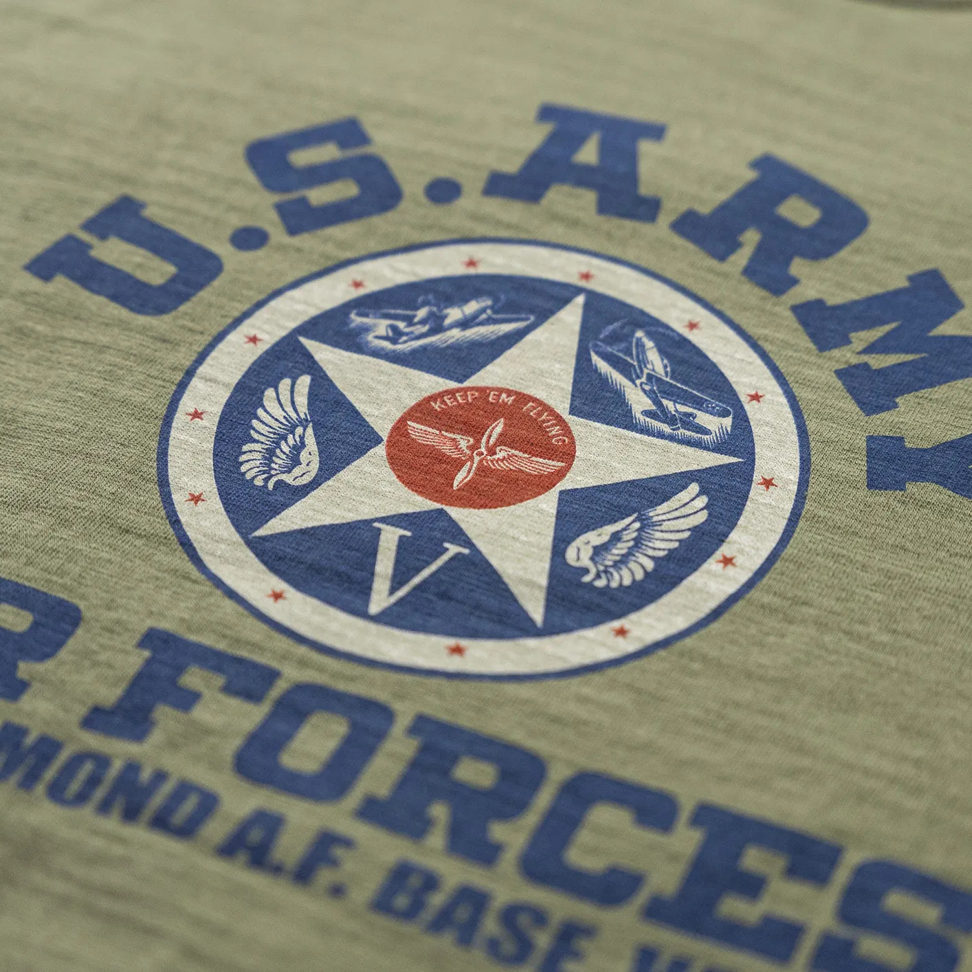 This tubular-knit tee by Buzz Rickson’s honors the legacy of the U.S. Army Air Forces with a bold chest print referencing the historic Richmond A.F. Base in Virginia - an active WWII training site for fighter squadrons. The center emblem combines aircraft symbols and the USAAF motto “Keep ’Em Flying” together with a classic propeller-and-wings emblem - which gets also featured at the t-shirts backside, framed in a star that once marked military gear.