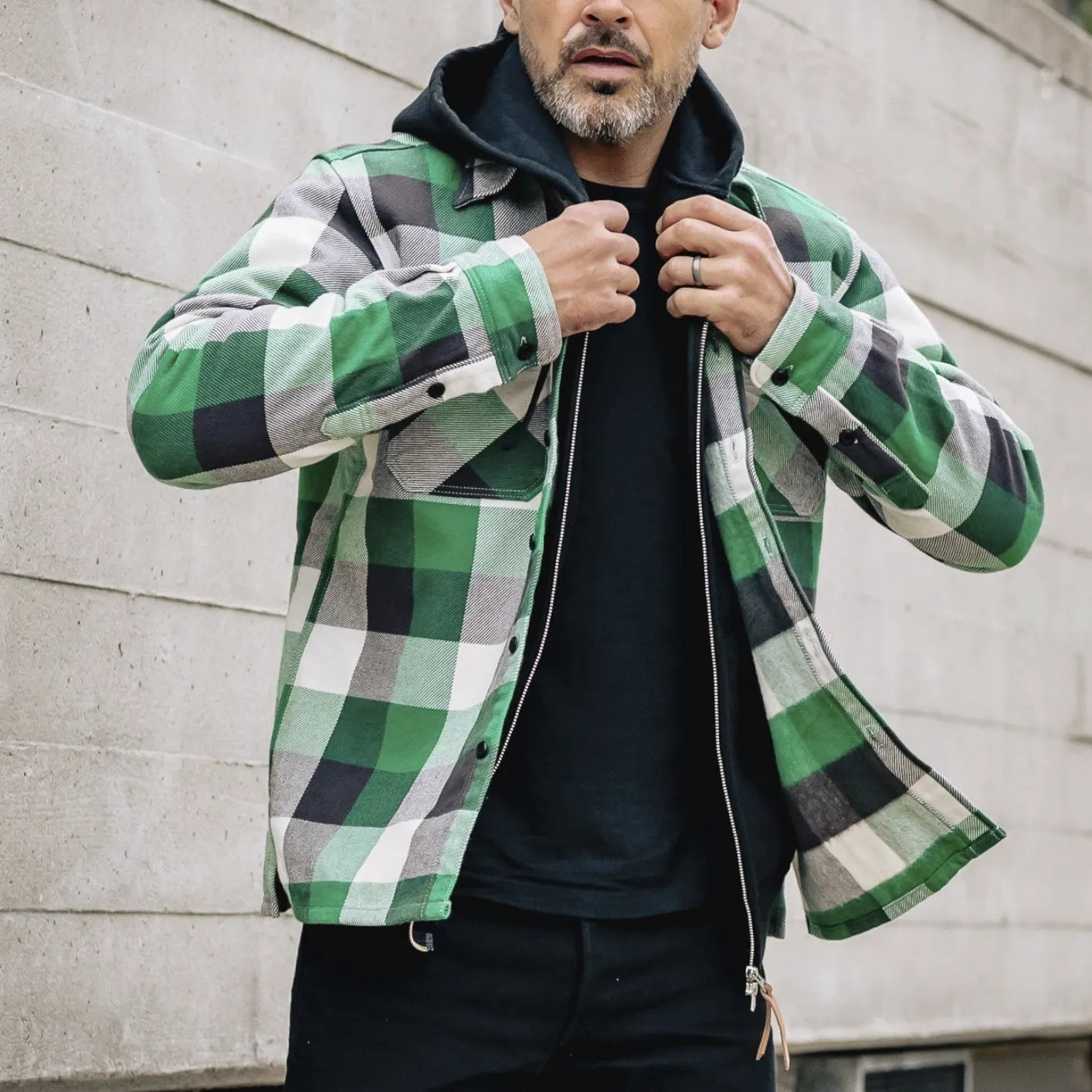 The Iron Heart 12oz Ultra Heavy Flannel Vintage Work Overshirt in Green Check embodies the brand’s core DNA—substantial, warm, and made to last. Woven from 12oz Aspero cotton, a rare wild cotton native to the foothills of the Andes, the fabric offers both natural strength and an incredibly soft touch. It’s double brushed inside and single brushed outside, creating a dense weave that’s wind-resistant yet surprisingly comfortable.