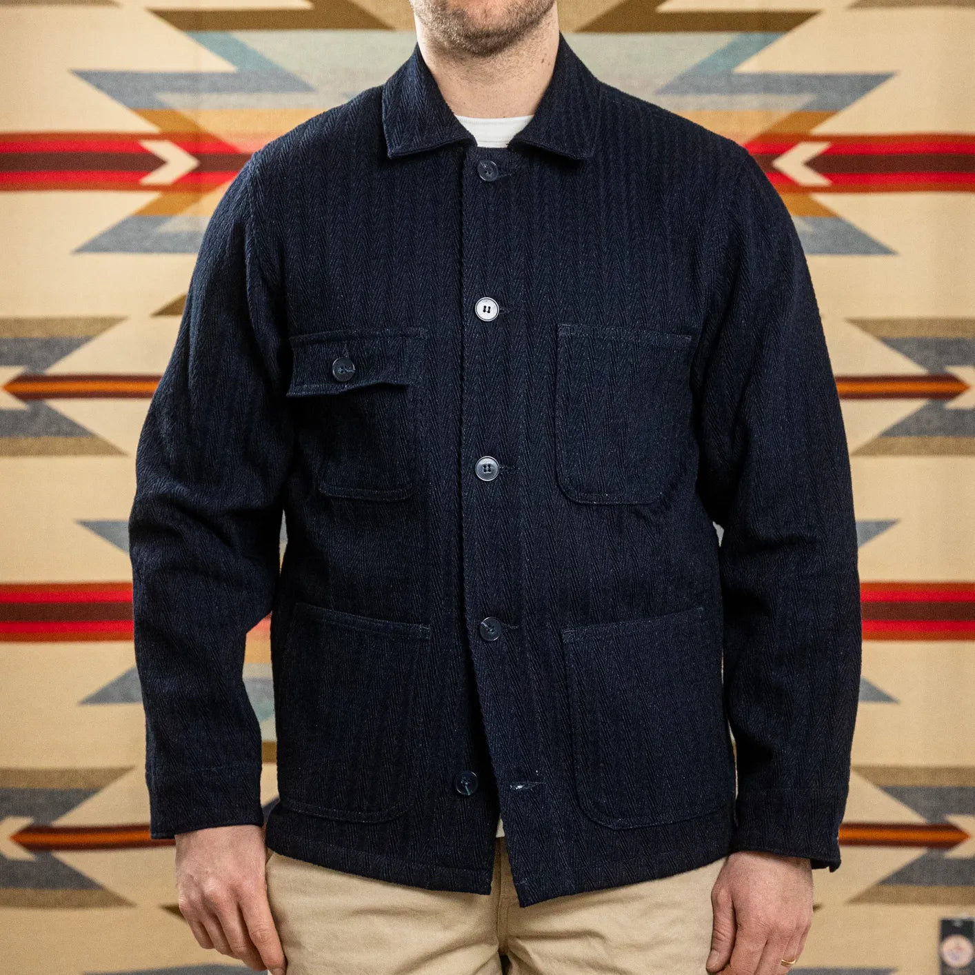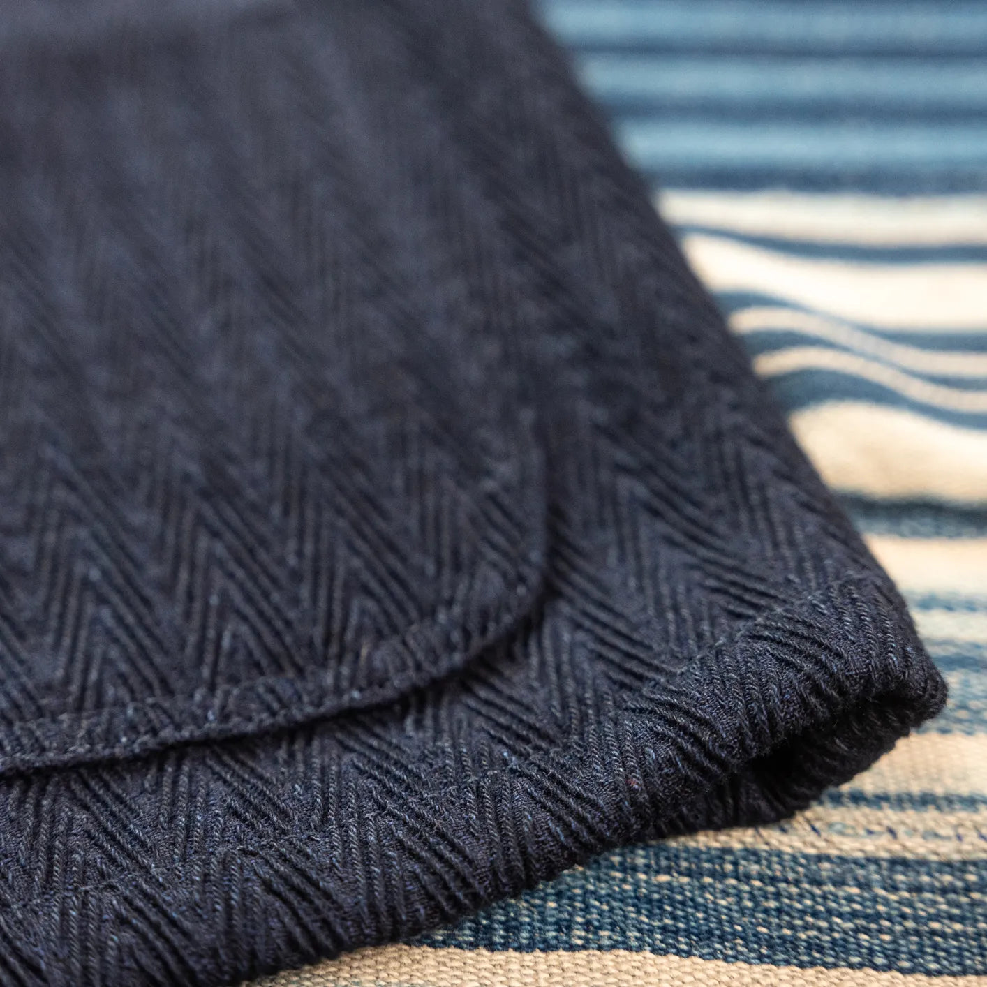 Known as Sugiaya, the structure references the subtle, cedar-like grain suggested by the tightly defined V-shaped pattern. After weaving, the fabric is rinsed to soften the hand and gently plump the yarns, giving the surface a tactile, three-dimensional texture that becomes more expressive with wear. Indigo dyeing ensures subtle contrast and depth as the coat ages.