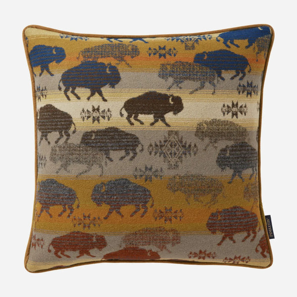 Celebrate the spirit of the American West with this wool jacquard pillow, where buffalo roam across warm, earthy tones of red, blue, and brown. Woven in Pendleton’s own mills, it brings Yellowstone-inspired wilderness right into your living space.