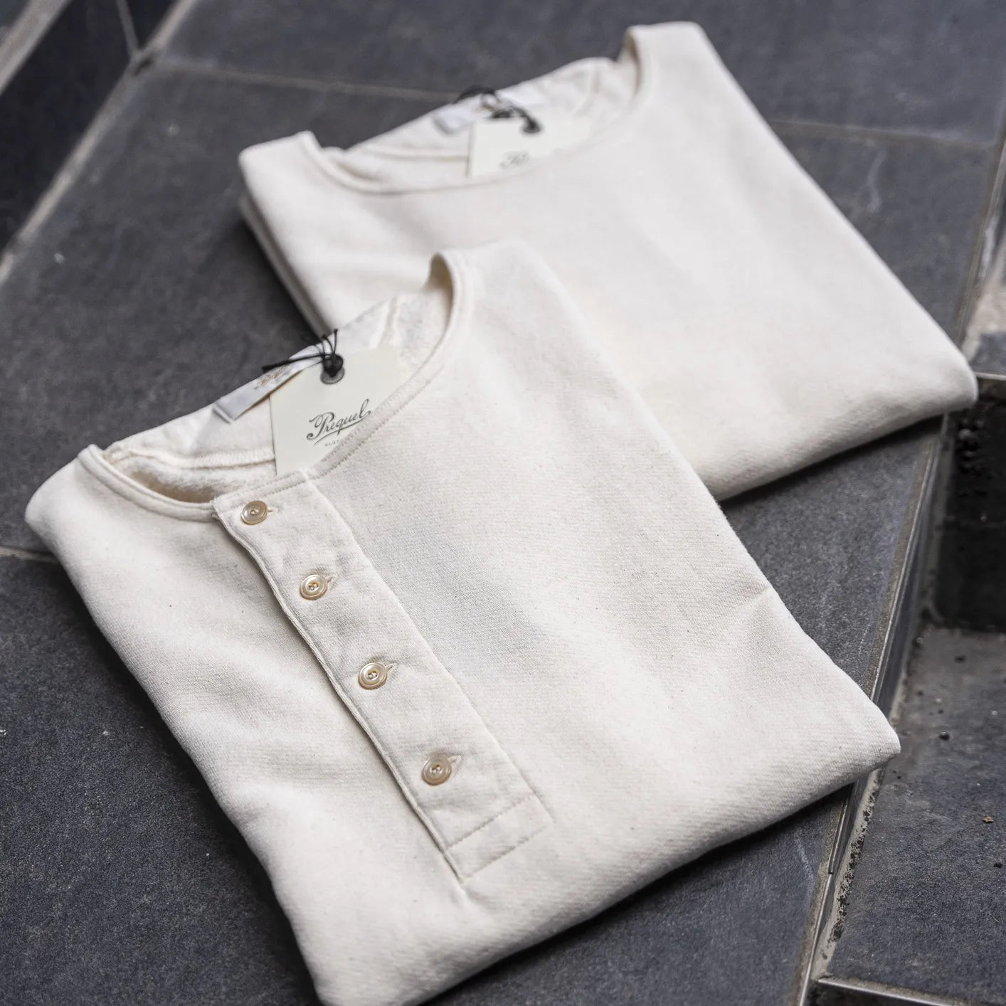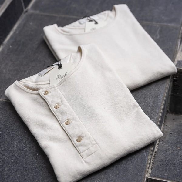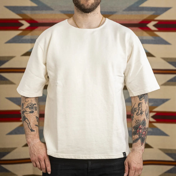 A minimalist classic with vintage depth. Inspired by 1950s athleticwear, this short-sleeved sweatshirt uses the same unbleached 10oz cotton fleece found in Prequel’s summer henley - only here in its purest form. The shape is simple and relaxed, the collar wide and clean, the hem neatly finished.
