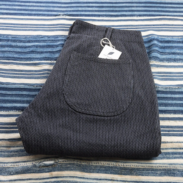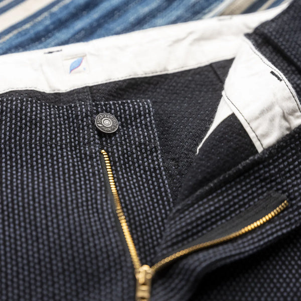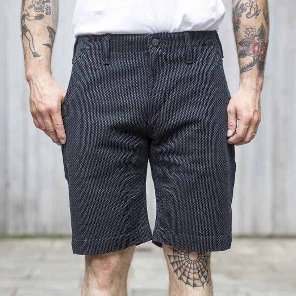 These Sashiko Shorts from Pure Blue Japan blend intricate tradition with summer-ready comfort. Their custom-woven 12.5oz jacquard Sashiko fabric, part of the Grey x Black edition, features a black warp and grey weft for classic, tonal contrast. Sashiko, which means „little stabs“, is a traditional Japanese technique that creates a unique three-dimensional texture.