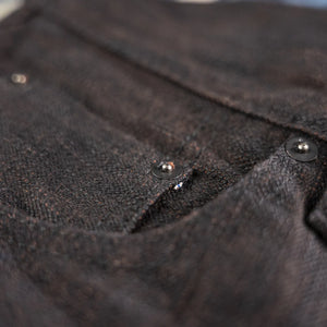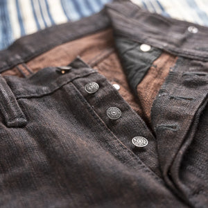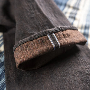 Woven from ultra-uneven yarns, the fabric delivers irregular vertical fading. The weft is dyed in kakishibu - a traditional Japanese technique dating back to the 13th century that uses fermented persimmon tannins. The result: a denim with a bold copper undertone, which, combined with the sulfur-dyed black warp, develops a uniquely rich patina over time. Sunlight deepens the kakishibu tones, gradually drawing out reddish-brown highlights at stress points - a depth of character that can’t be replicated.