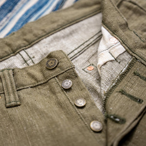 Uguisu is a small olive-green bird, also known as Japanese nightingale (Japanese bush warbler), which signals the start of spring in Japan. Uguisu's green color has a long history in Japan, dating back to the Edo period, and became a fashionable color in the late Meiji period. Uguisu denim combines this aesthetic with an old British military feel, replicating the dyeing technique of old army pants. With a special slub yarn and 17oz of fabric, the denim is made by Shinya mills. Samurai buttons feature a plum design, inspired by the uguisu's depiction in the ancient Japanese card game "Hanafuda."