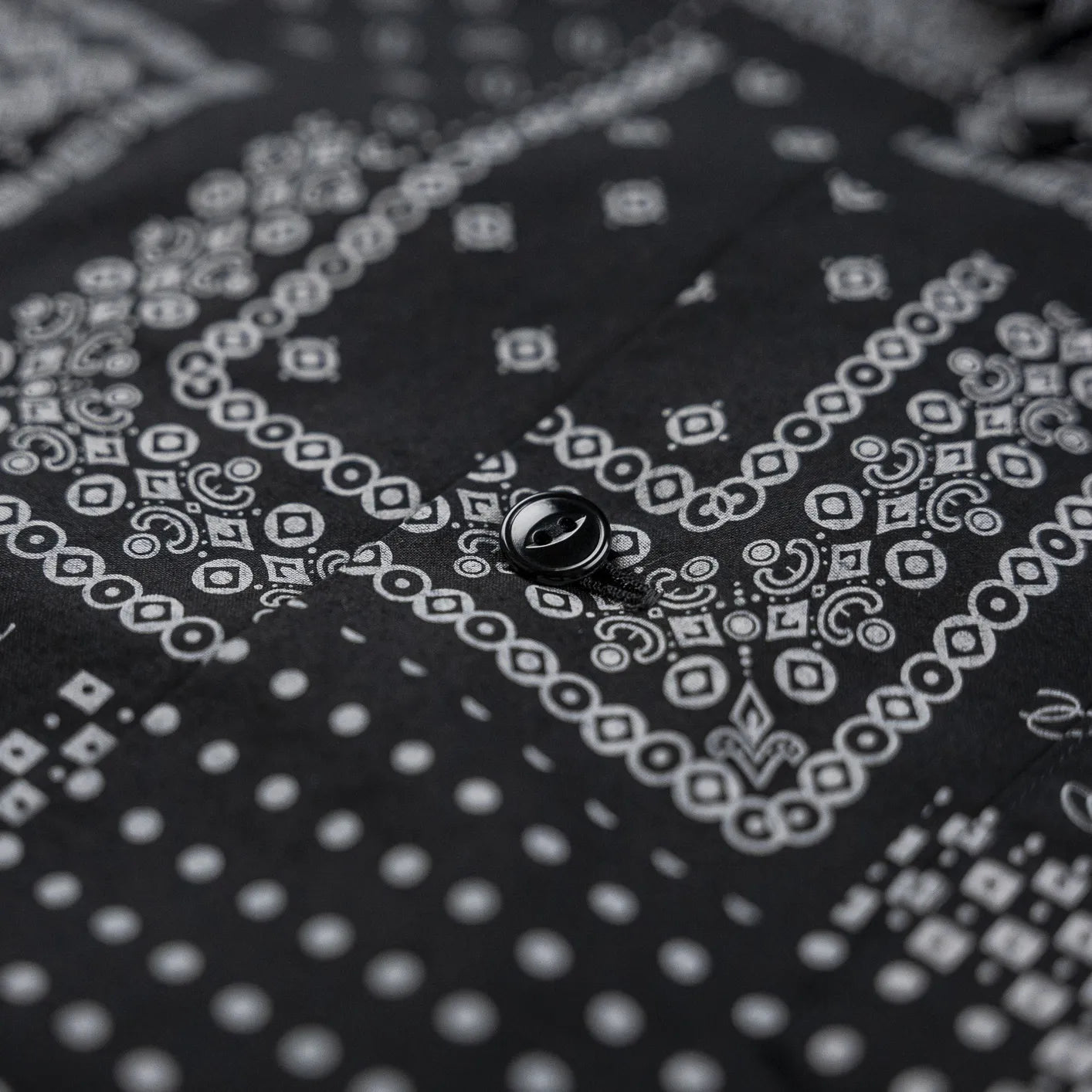 Step into a story woven from iconic Americana and the rich history of classic bandana patterns. Sugar Cane’s Bandana Patchwork Camp Collar Shirt is a visual tapestry of timeless bandana motifs: polka dots, intricate paisley, and bold geometric shapes are meticulously collaged and screen-printed onto a robust black cotton fabric. This unique design creates a vivid, textured surface that promises to soften and hold to the body with wear.