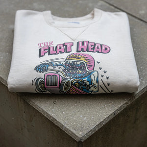 The Flat Head loopwheeled sweater is already a sensation due to its plush softness and substantial weight, even before factoring in the stunning 'Kamikaze' custom car culture-inspired print design. Made from 12oz loopwheeled fabric crafted from extra-thick yarns and brushed on the inside, it offers exceptional comfort. Vintage details like Union Special flat-seam construction, the V-gusset, and double-needle stitching around the ribbed neckline complete this remarkable essential. Honestly, every day you can't wear this sweatshirt will be a sad day – believe us!
