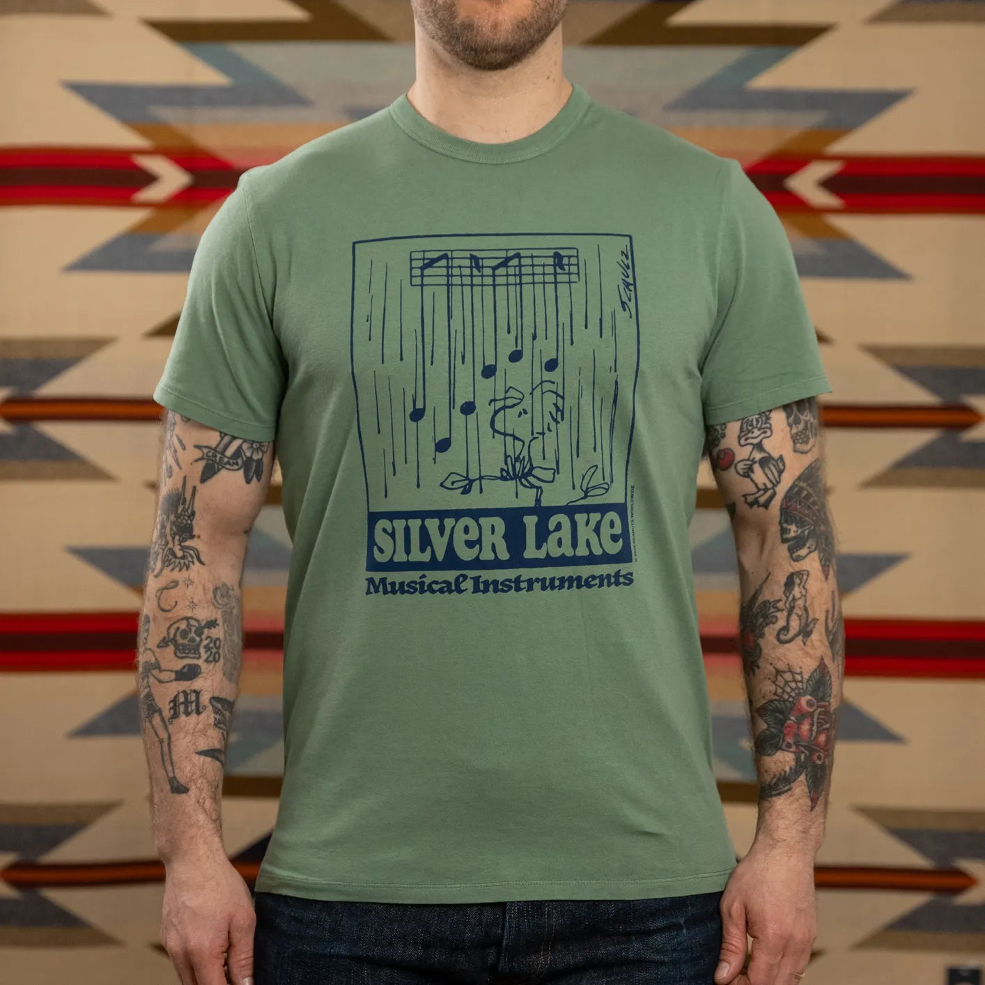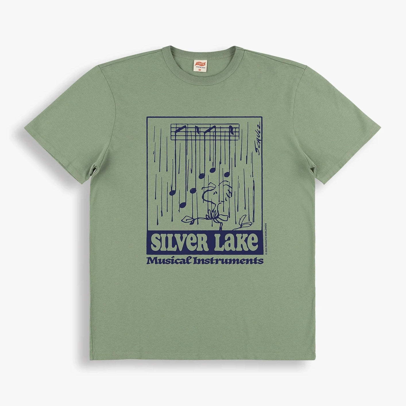 Inspired by a 1974 original advertisement for the legendary Silver Lake Musical Instruments store in Los Angeles, this tee captures the spirit of a place where music, youth culture and West Coast optimism collided. The print reproduces the vintage advert featuring Woodstock — a playful nod to riffs, records and rhythm in the heart of Silver Lake.